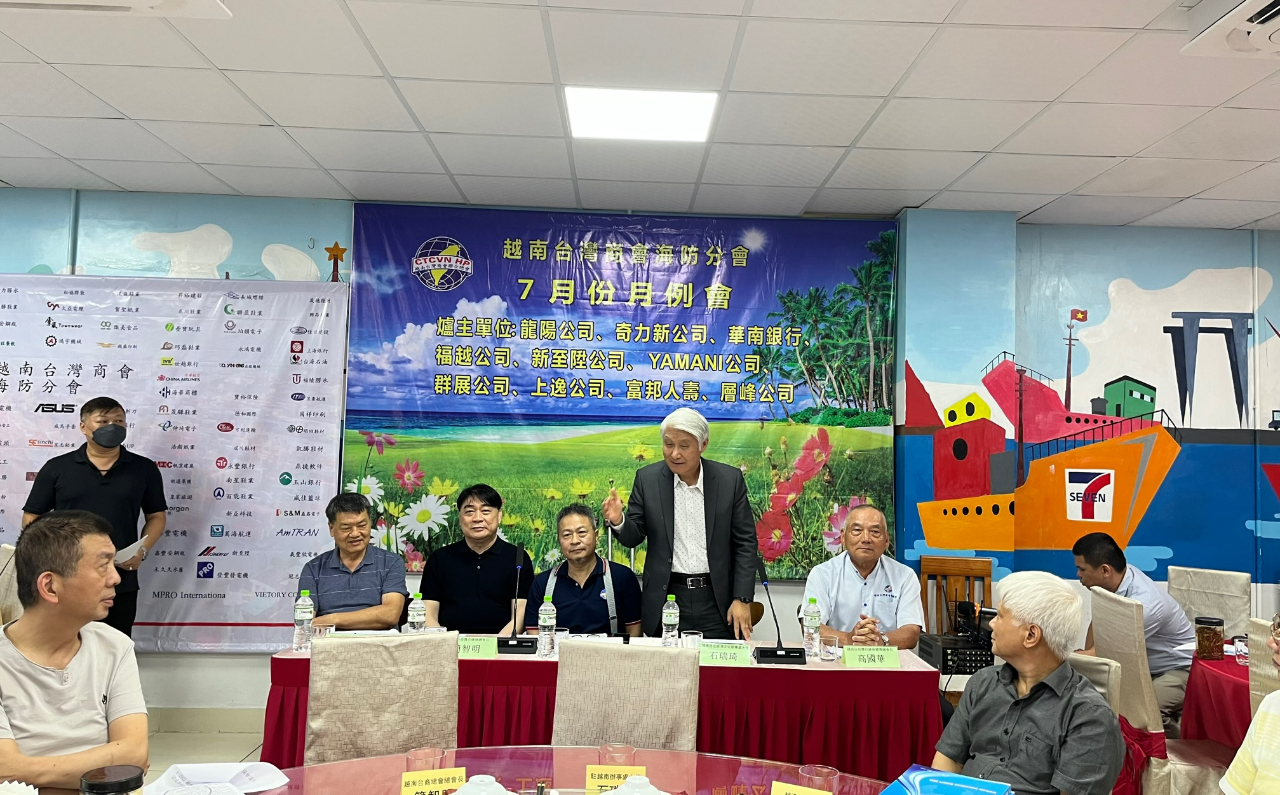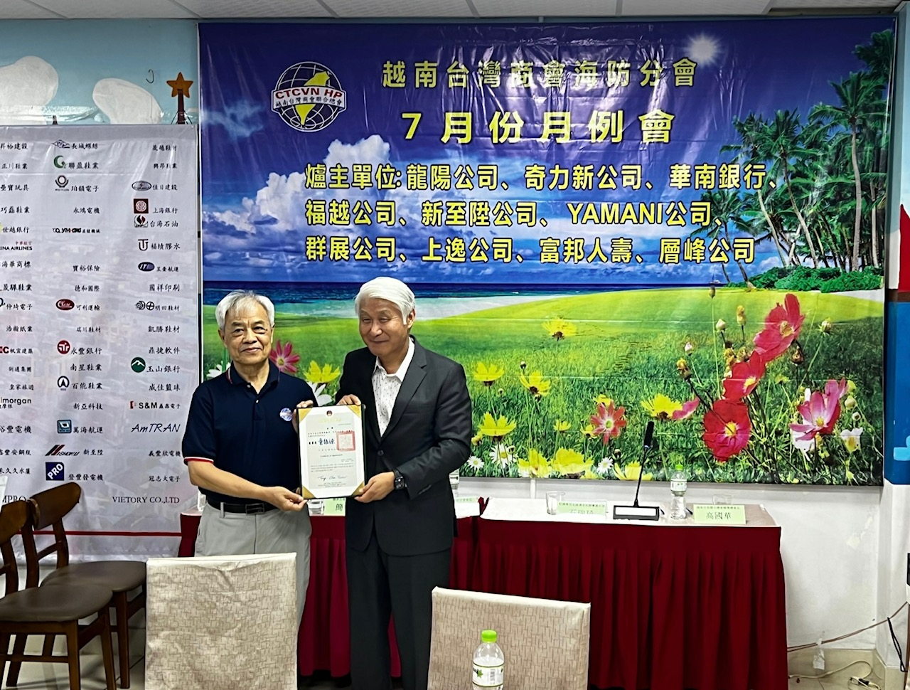 越南臺灣商會聯合總會海防分會於7月23日舉辦「7月份月例會」,由分會會長王坤生主持,僑務諮詢委員高國華、李旋門、僑務顧問柯秋木、金國孝、僑務促進委員蔡建修、張家農、越南臺灣商會聯合總會總會長簡智明、西寧分會會長郭海豐,以及海防分會理監事及會員等近120人出席,駐越南代表處大使石瑞琦偕經濟組秘書戴伯勳及僑務秘書蔡佩珊應邀前往參加。