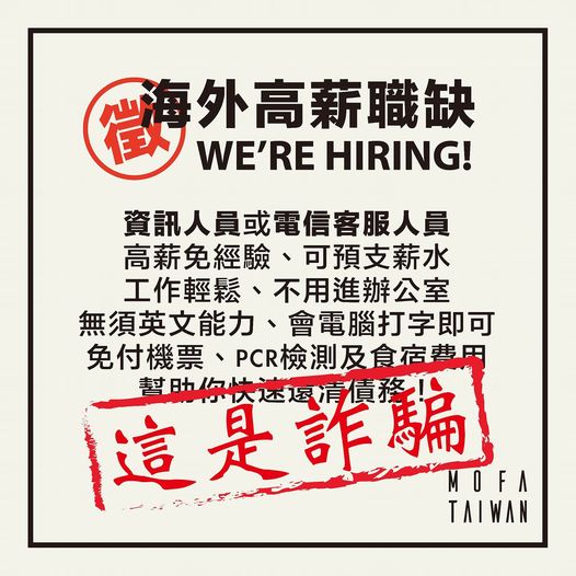 高薪陷阱多!國人遭誘騙赴國外從事不法工作案件層出不窮,外交部成立海外求職陷阱宣導專區,彙集相關案例資料,呼籲國人切勿輕信不實網路招募廣告。