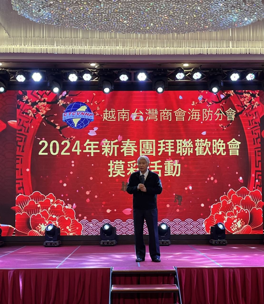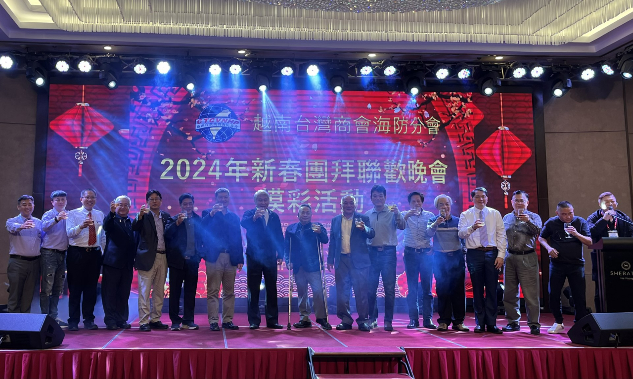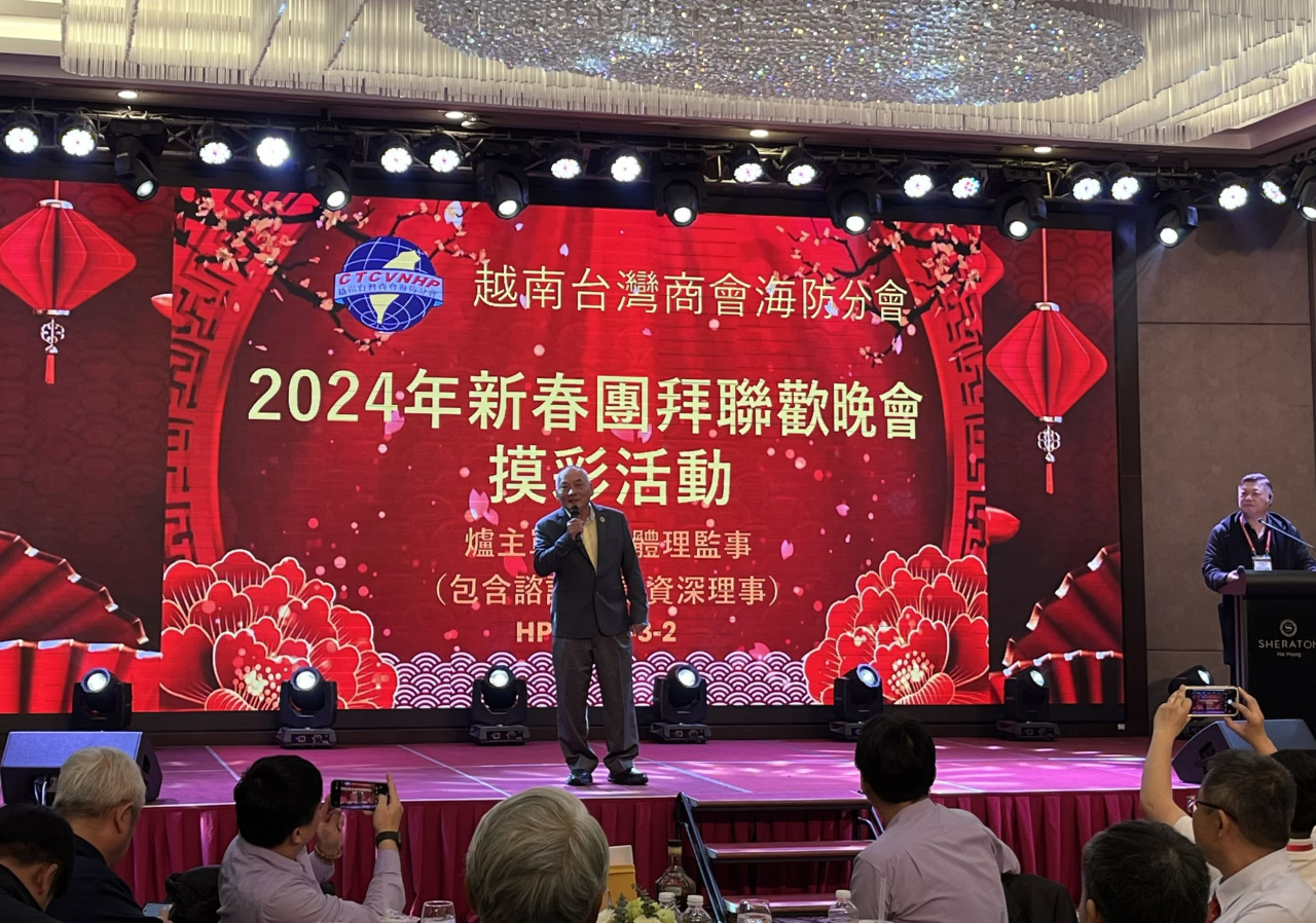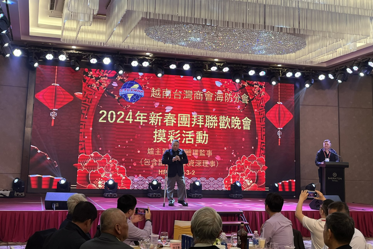 越南臺灣商會聯合總會海防分會於3月2日舉辦「2024年新春團拜聯歡晚會暨摸彩活動」,由會長王坤生主持,包括僑務諮詢委員高國華、僑務顧問金國孝、陳威銘、柯秋木、僑務促進委員張畯珅、張家農、胡志明市分會名譽會長錢宣甫、河內分會副會長楊志文、河靜分會副會長陳志豪、監事長林聖倫、同奈分會監事長王吟寧、臺灣貿易中心駐河內辦事處主任施懿恬,以及商會理監事及會員等約180人參加。駐越南代表處大使石瑞琦偕教育組組長朱多銘、經濟組組長丁偉、秘書詹修明、秘書白博文及僑務秘書蔡佩珊應邀出席。