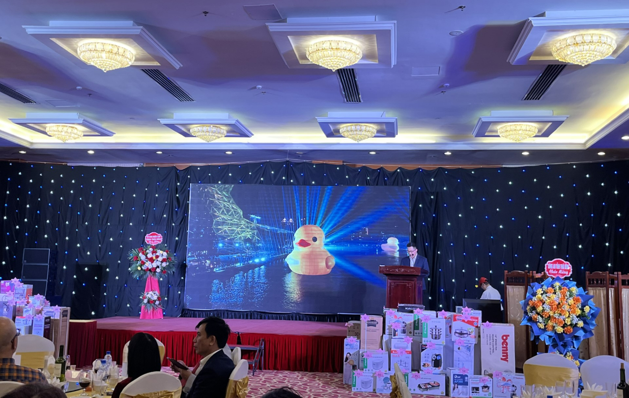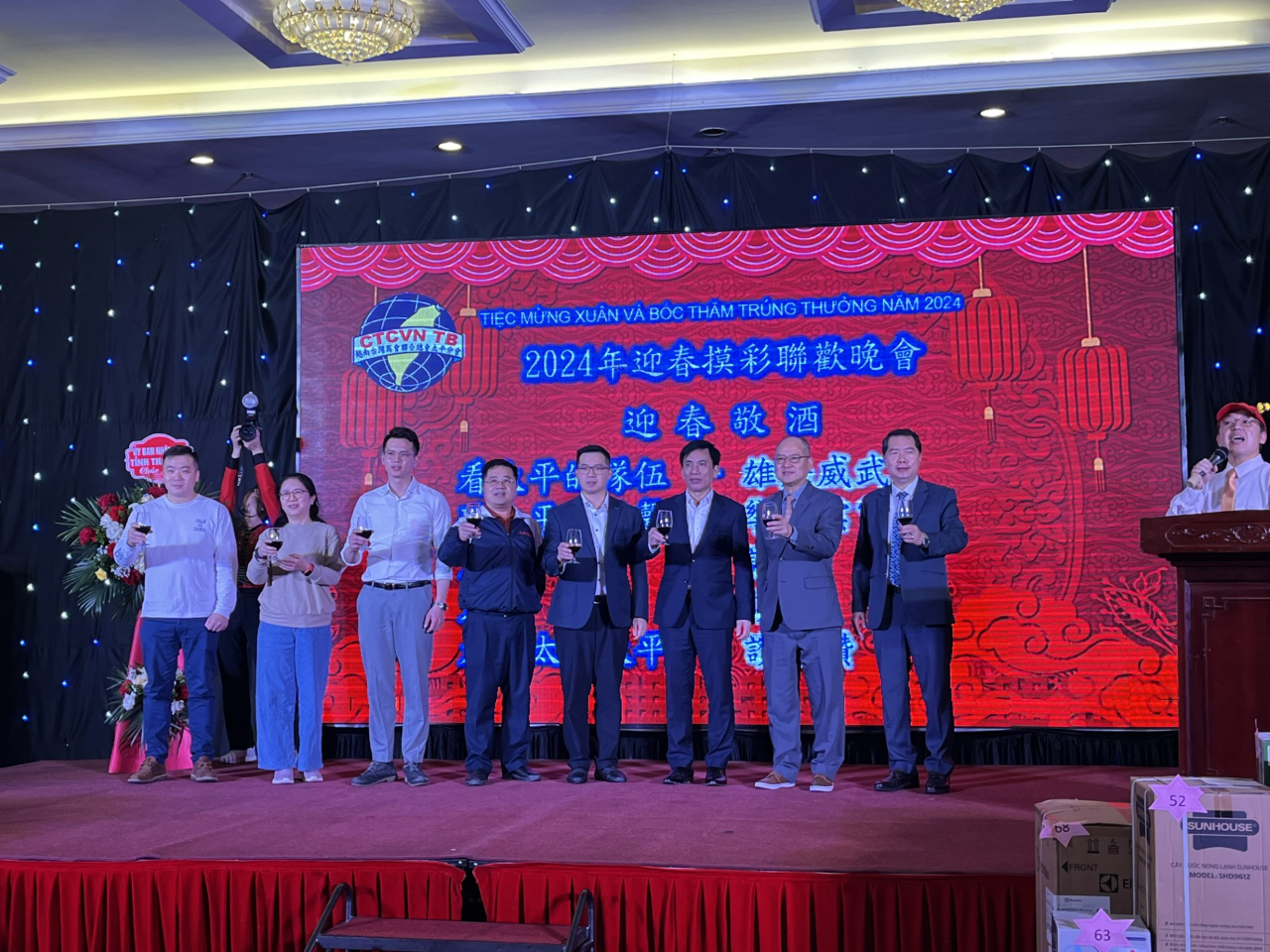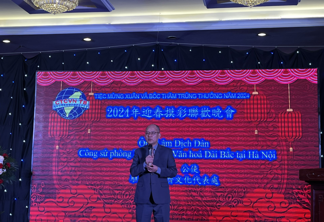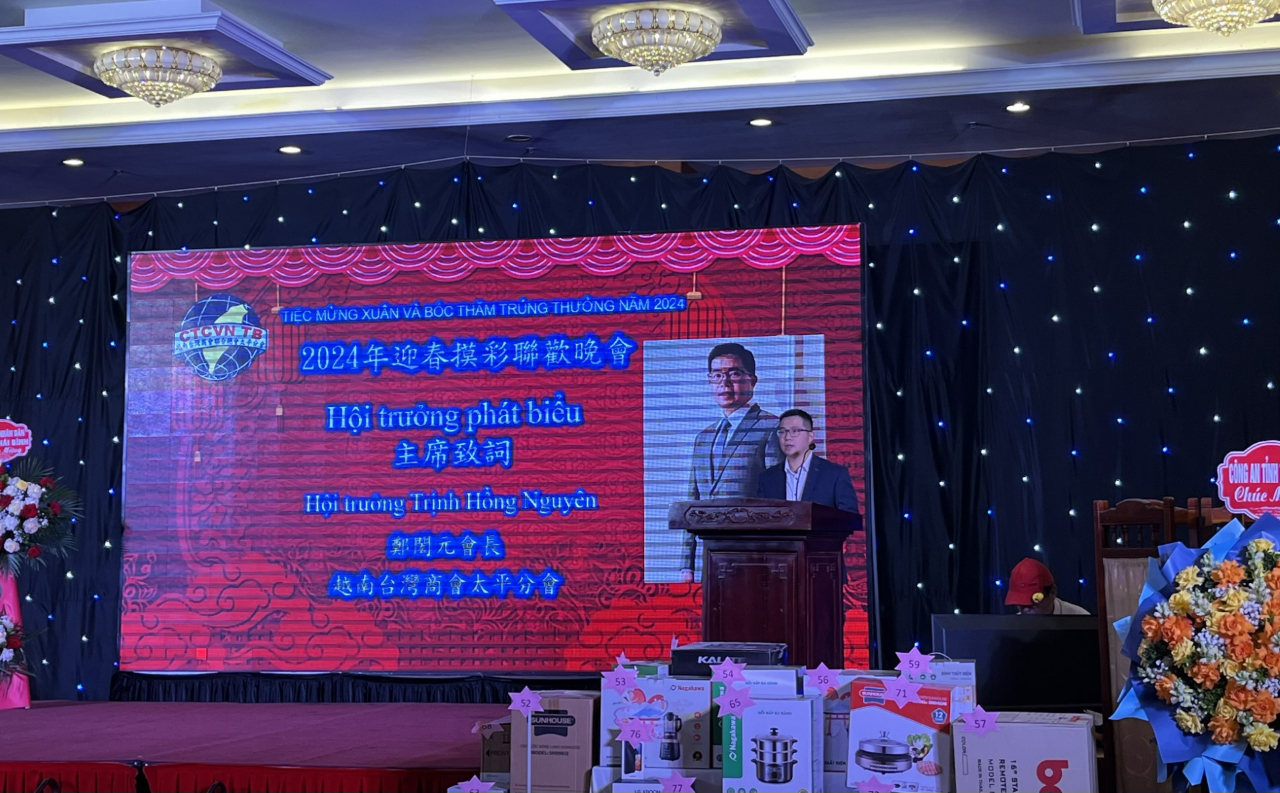 越南臺灣商會聯合總會太平分會3月16日舉辦「2024年迎春摸彩聯歡晚會」,由會長鄭閎元主持,包括僑務諮詢委員陳耀奎、僑務顧問黃秀滿、僑務促進委員張家農、越南臺商總會總會長蔡文瑞、北寧分會會長林軒節、太平省經濟區及工業區管理委員會副主委范廷煜(Phan Dình Dực)等多位政府官員,以及商會監事長彭素琴、理監事及會員等近150人參加。駐越南代表處公使林易民偕經濟組組長丁偉及僑務秘書蔡佩珊應邀出席。