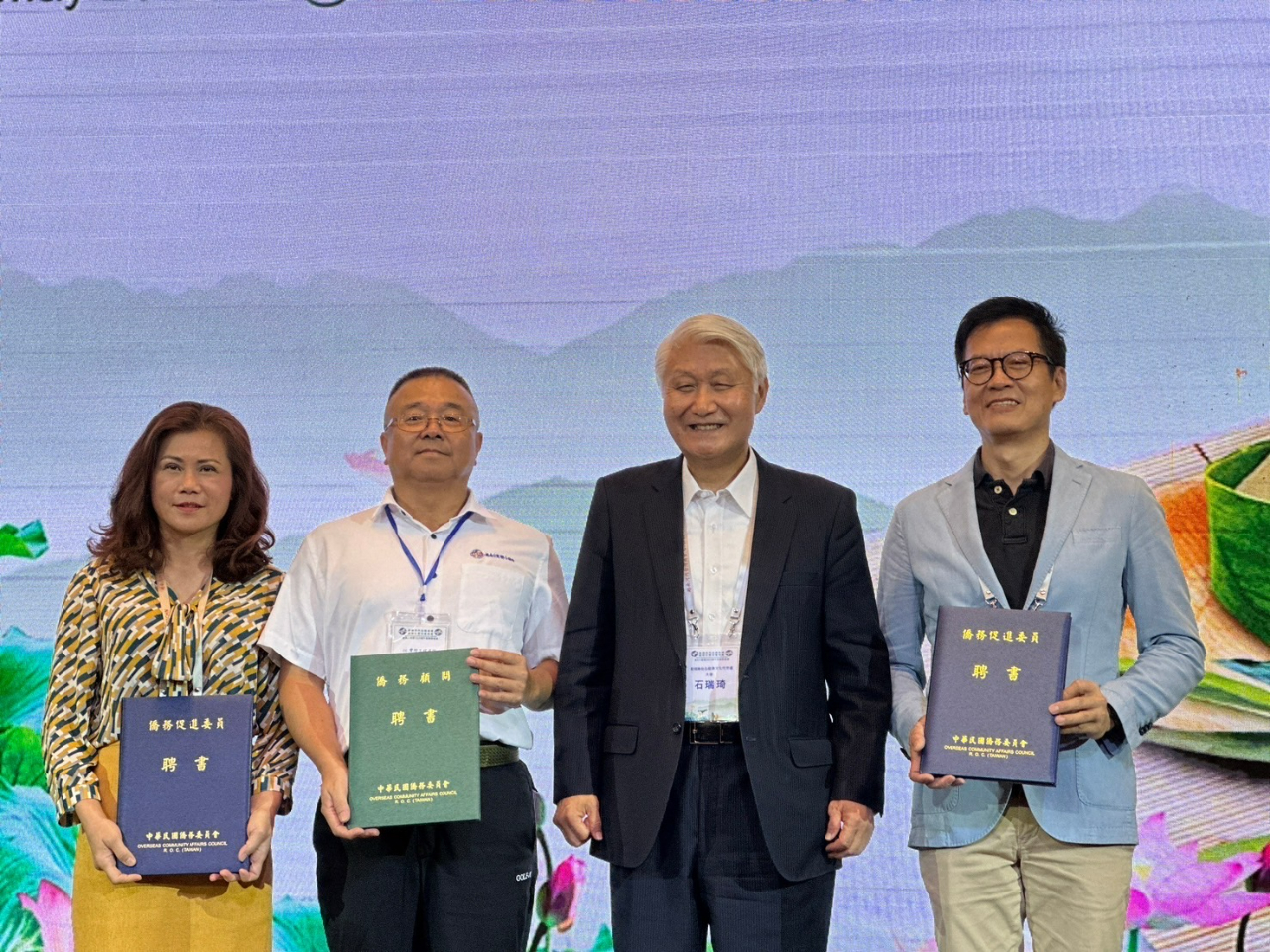 駐越南代表處大使石瑞琦(右二)代表僑委會委員長徐佳青致頒續任僑務顧問黃雍正(左二),以及新任僑務促進委員鄧明敦(右一)、陳秋蓉(左一)聘書