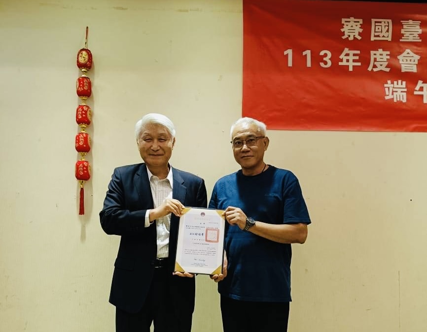 駐越南代表處大使石瑞琦(左)代表僑委會委員長徐佳青致頒續任僑務促進委員劉啟宗(右)聘書