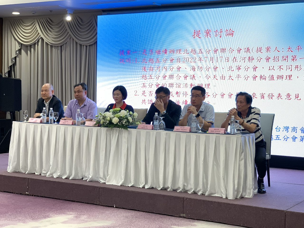 越南臺灣商會聯合總會太平分會6月21日於南定省南強大飯店舉辦「越南臺灣商會北部五分會第五次聯合會議」暨餐敘,由該會監事長彭素琴主持。包括僑務委員洪志華、僑務促進委員張畯珅、陳文進、臺灣貿易中心駐河內辦事處主任施懿恬、越南臺商總會總會長蔡文瑞、監事長黃雍正、北寧分會會長林軒節、河靜分會會長葉富國、海防分會首席副會長林義棠、河內商會副會長朱桂良,以及各商會理監事等近60人參加,駐越南代表處公使林易民偕經濟組組長丁偉及僑務秘書蔡佩珊應邀與會。