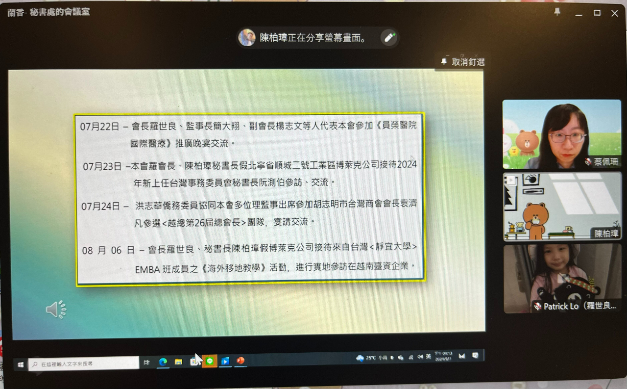羅世良致詞表示,因應強烈颱風摩羯侵襲越南北部,本次理監事聯席會議特別改採線上方式舉辦,同時提醒會員們非必要切勿出門,以維護人身安全,並說明商會中秋節聯歡晚會已順延至9月14日舉行,屆時歡迎會員們踴躍參加。
