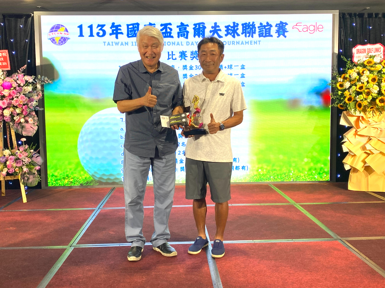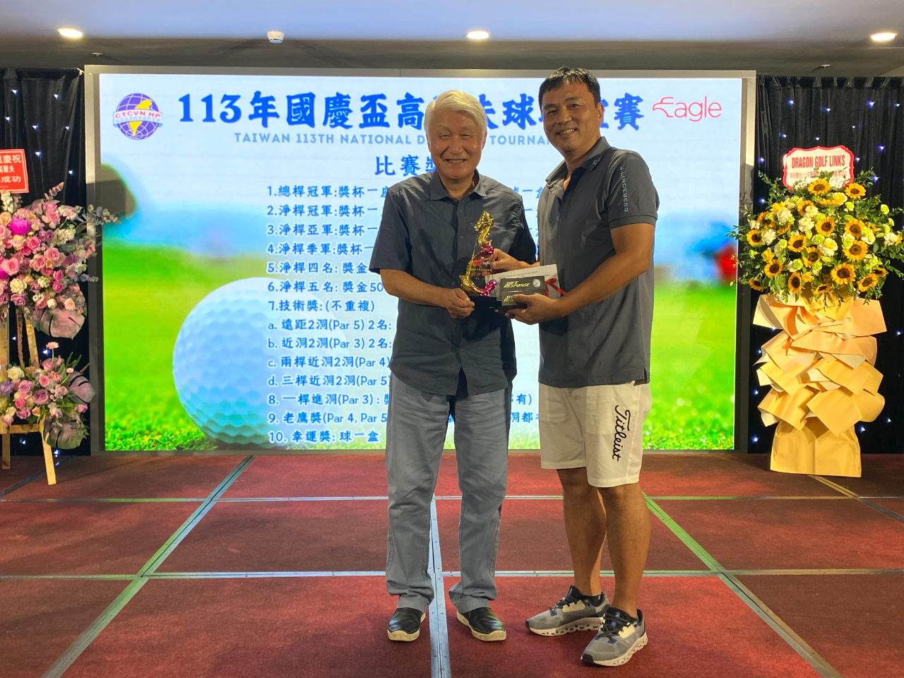 駐越南代表處石瑞琦大使(左)頒發冠軍獎牌及獎金予淨桿冠軍林恒旭先生(右)