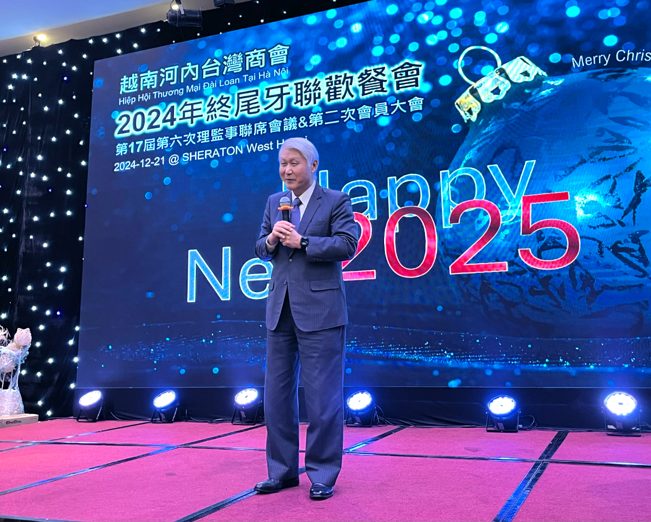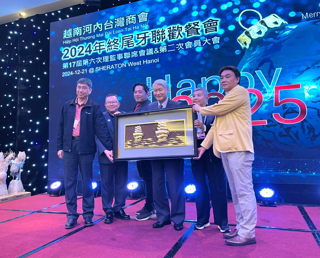 越南臺灣商會聯合總會河內分會於12月21日舉辦「第十七屆第五次理監事聯席會議、第二次會員大會暨2024年終尾牙聯歡餐會」,由會長羅世良主持,包括僑務委員洪志華、謝明輝、僑務諮詢委員蔡寵恩、僑務顧問李國隆、太平分會會長鄭閎元、監事長彭素琴、河內分會名譽會長盧智生、越南臺灣事務委員會秘書長阮側柏,以及商會理監事及會員等約160人參加。駐越南代表處大使石瑞琦偕經濟組組長丁偉、政治組副組長趙世絢、秘書顏銘男、林海洋及僑務秘書蔡佩珊應邀出席。