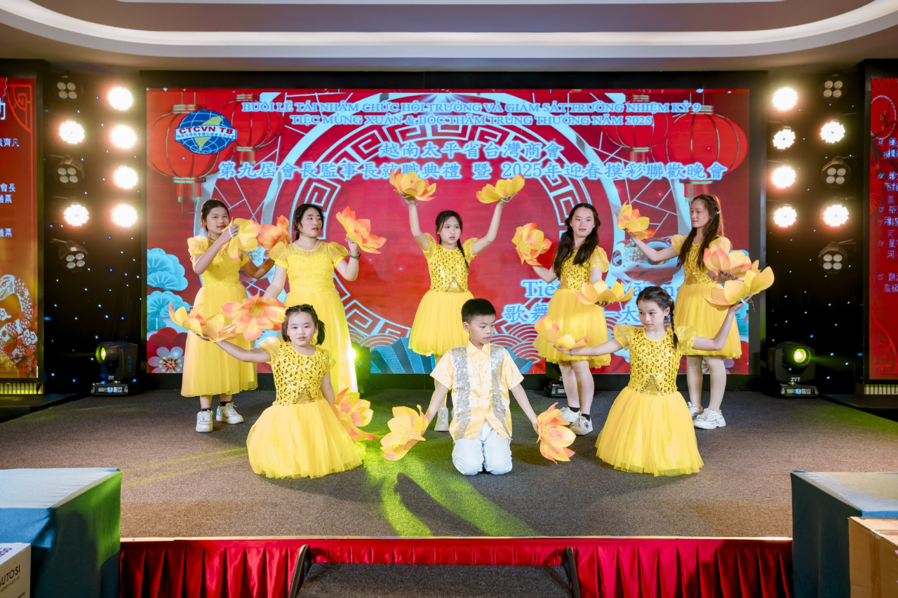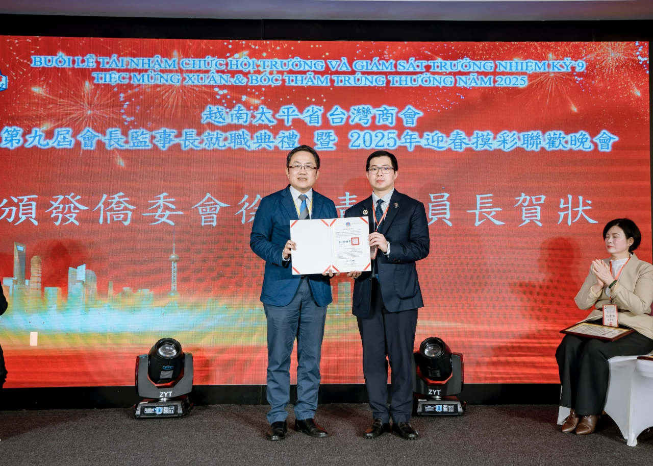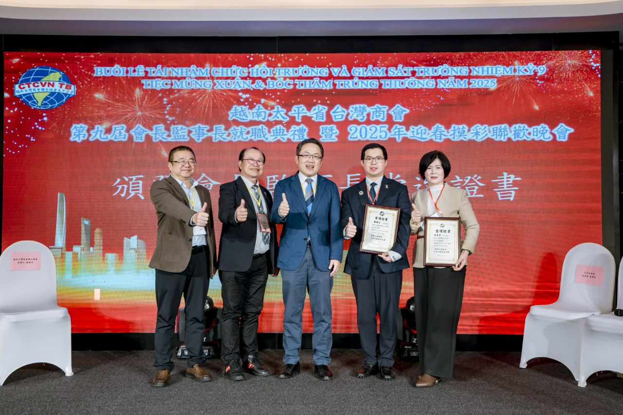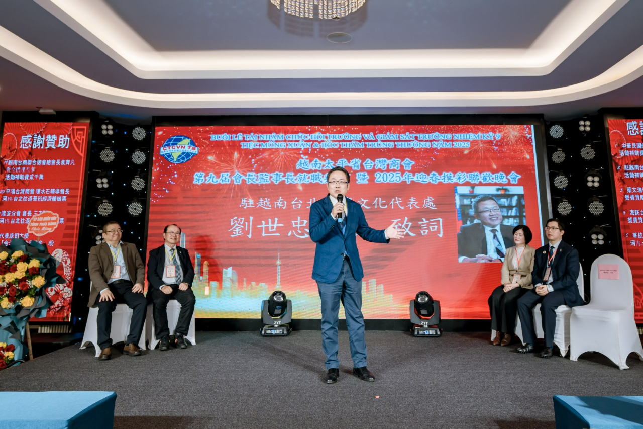 越南臺灣商會聯合總會太平分會3月8日舉辦「第九屆會長監事長就職典禮暨2025年迎春摸彩聯歡晚會」,包括僑務委員洪志華、蔡文瑞、越南臺商總會總會長袁濟凡、監事長黃雍正、北寧分會會長林軒節、隆安分會會長王志堅、寧平分會會長劉俊麟、越南臺灣事務委員會秘書長阮側柏、前秘書長蘇國俊、太平省政府官員,以及商會理監事及會員等約160人參加。駐越南代表處大使劉世忠偕公使林易民、政治組秘書詹修明、經濟組秘書劉行健及僑務秘書蔡佩珊應邀出席。