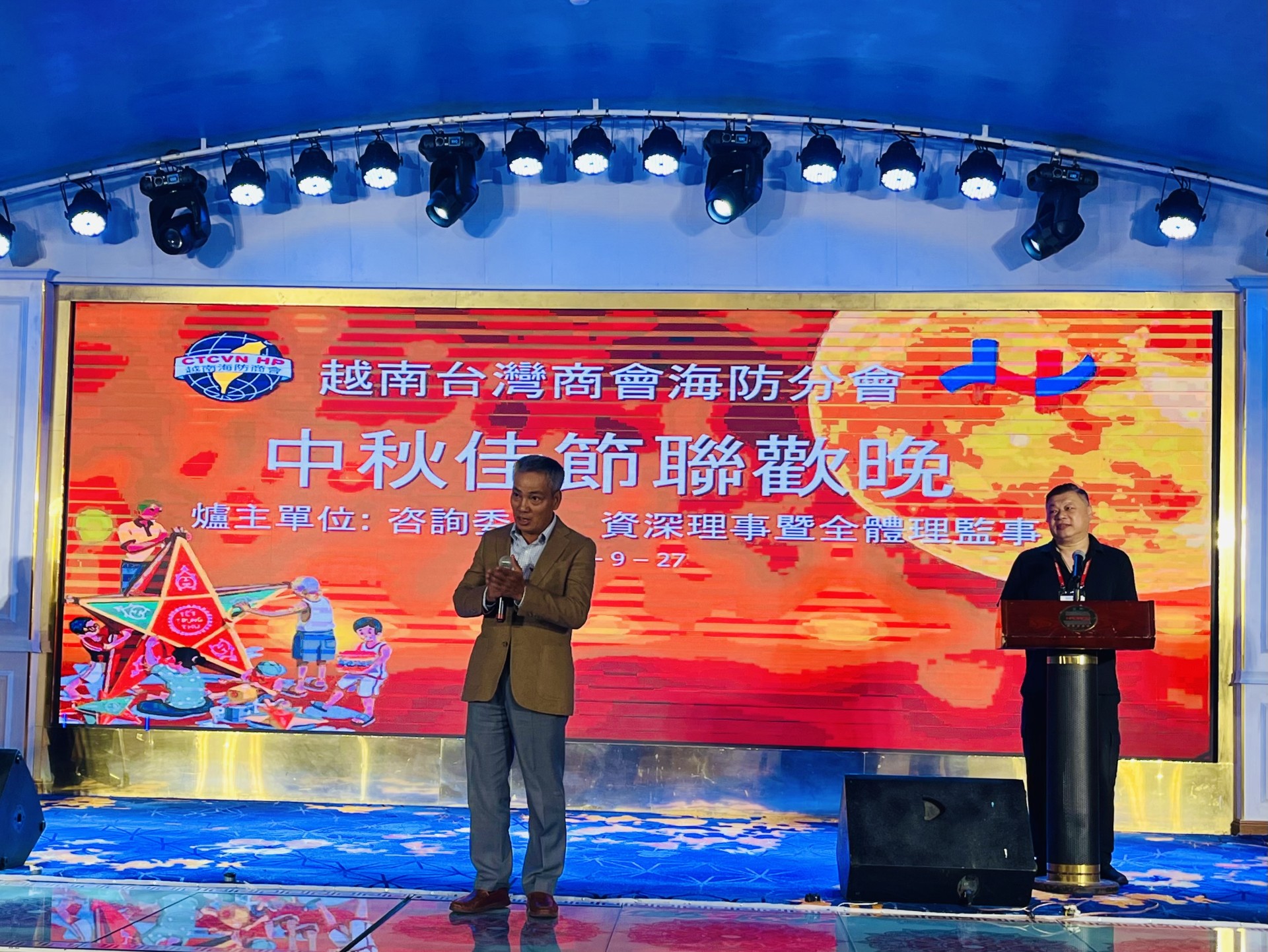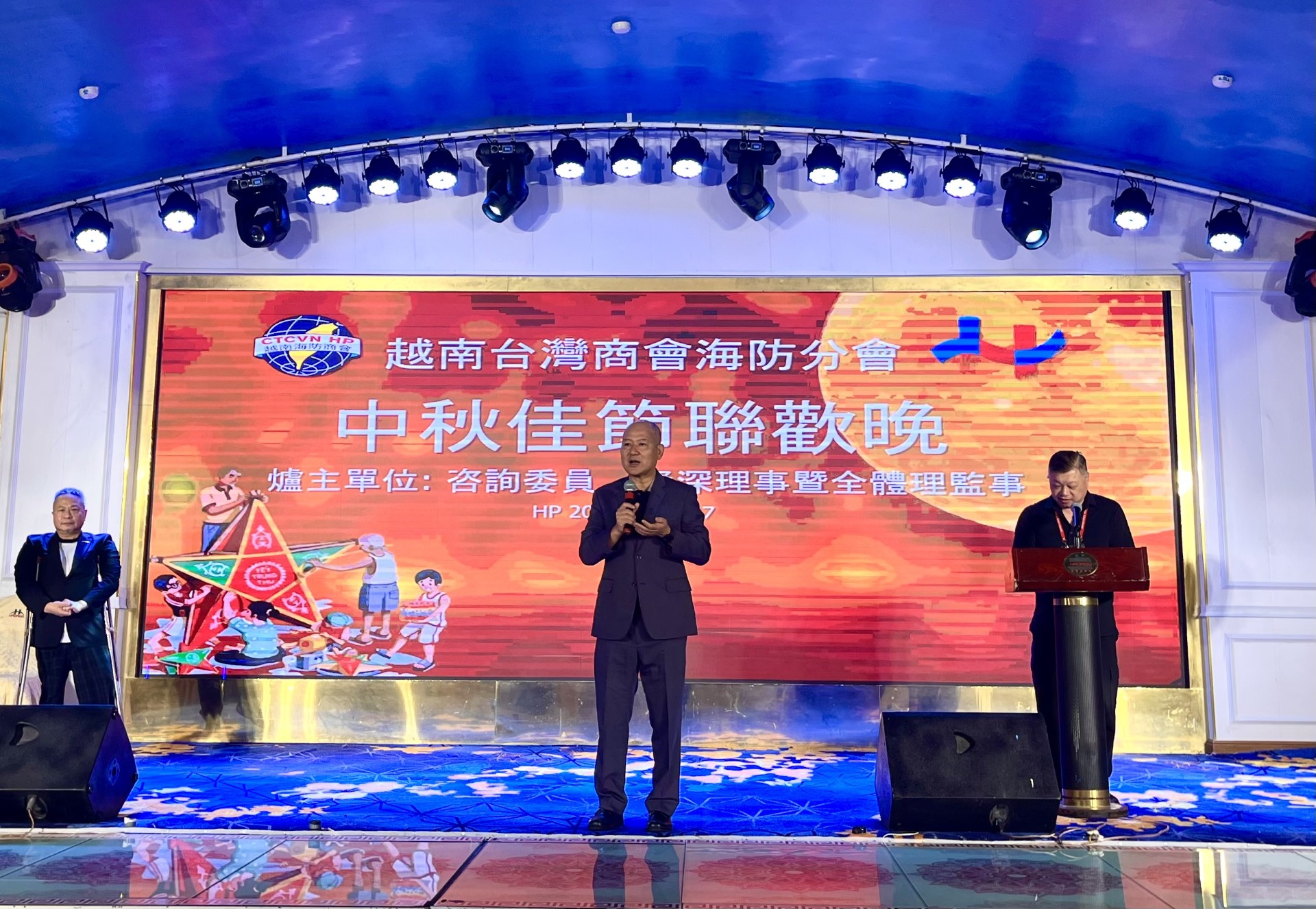 越南臺灣商會聯合總會海防分會於9月27日舉辦「中秋佳節聯歡晚會」,由會長王坤生主持,包括僑務諮詢委員高國華、僑務顧問金國孝、陳威銘、柯秋木、監事長鍾良有、越南臺灣事務委員會秘書長阮側柏、商會理監事及會員等近200人參加。駐越南代表處公使林易民偕經濟組秘書劉行健、法務秘書林怡玲、移民秘書王乙琇及僑務秘書蔡佩珊應邀出席。