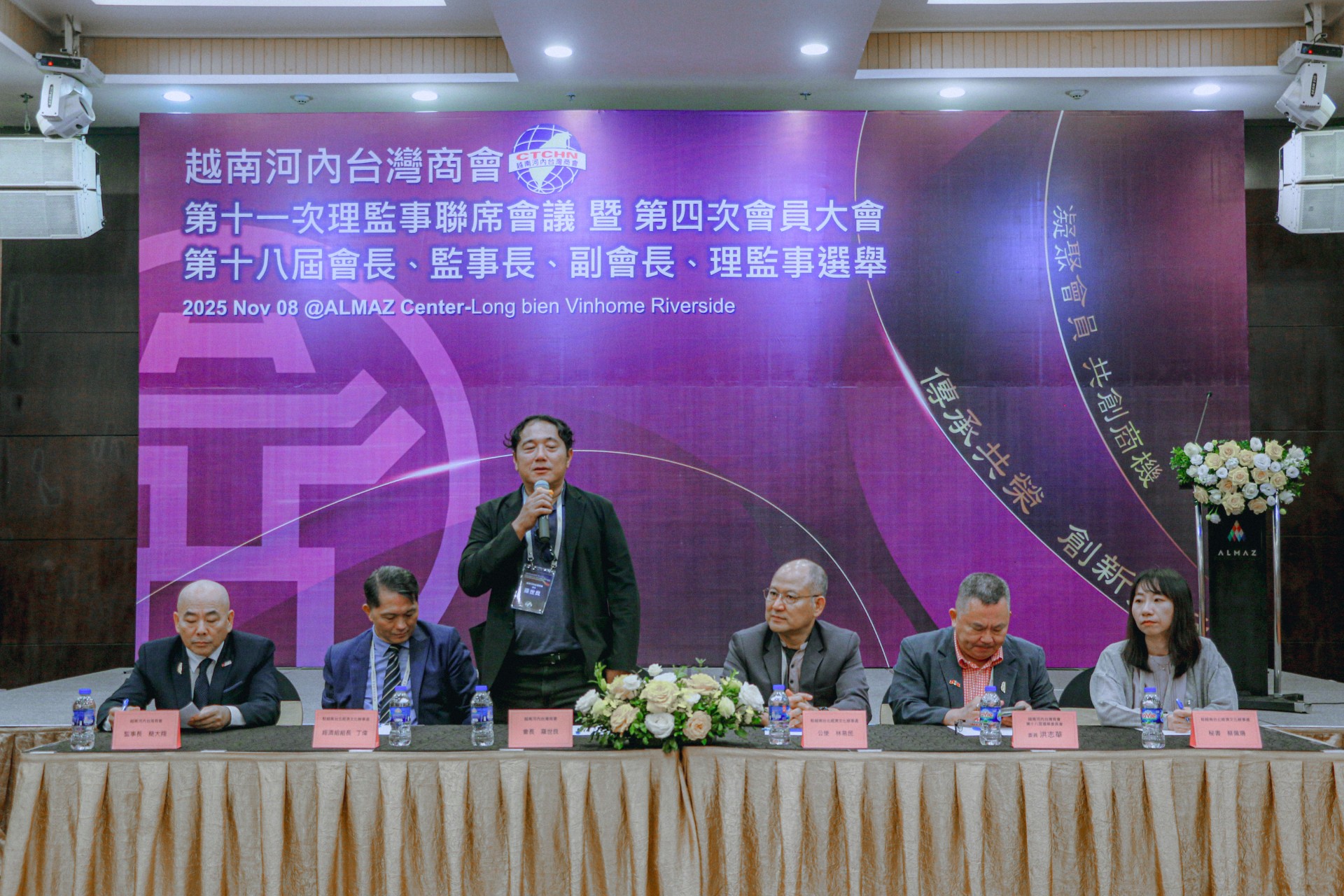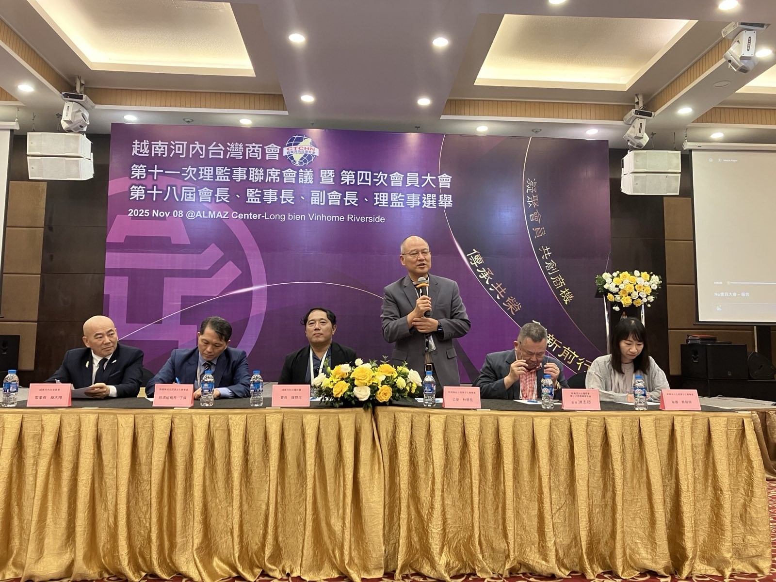 越南臺灣商會聯合總會河內分會11月8日舉辦「第十七屆第十一次理監事聯席會議、第四次會員大會暨第十八屆會長、監事長、副會長、理監事選舉」,由會長羅世良主持,包括駐越南代表處公使林易民、經濟組組長丁偉、秘書劉行健、科技組組長鄧文玲、僑務秘書蔡佩珊、僑務委員洪志華、僑務諮詢委員蔡寵恩、陳耀奎、越南臺灣事務委員會秘書長阮側柏、商會理監事及會員等逾100人出席。