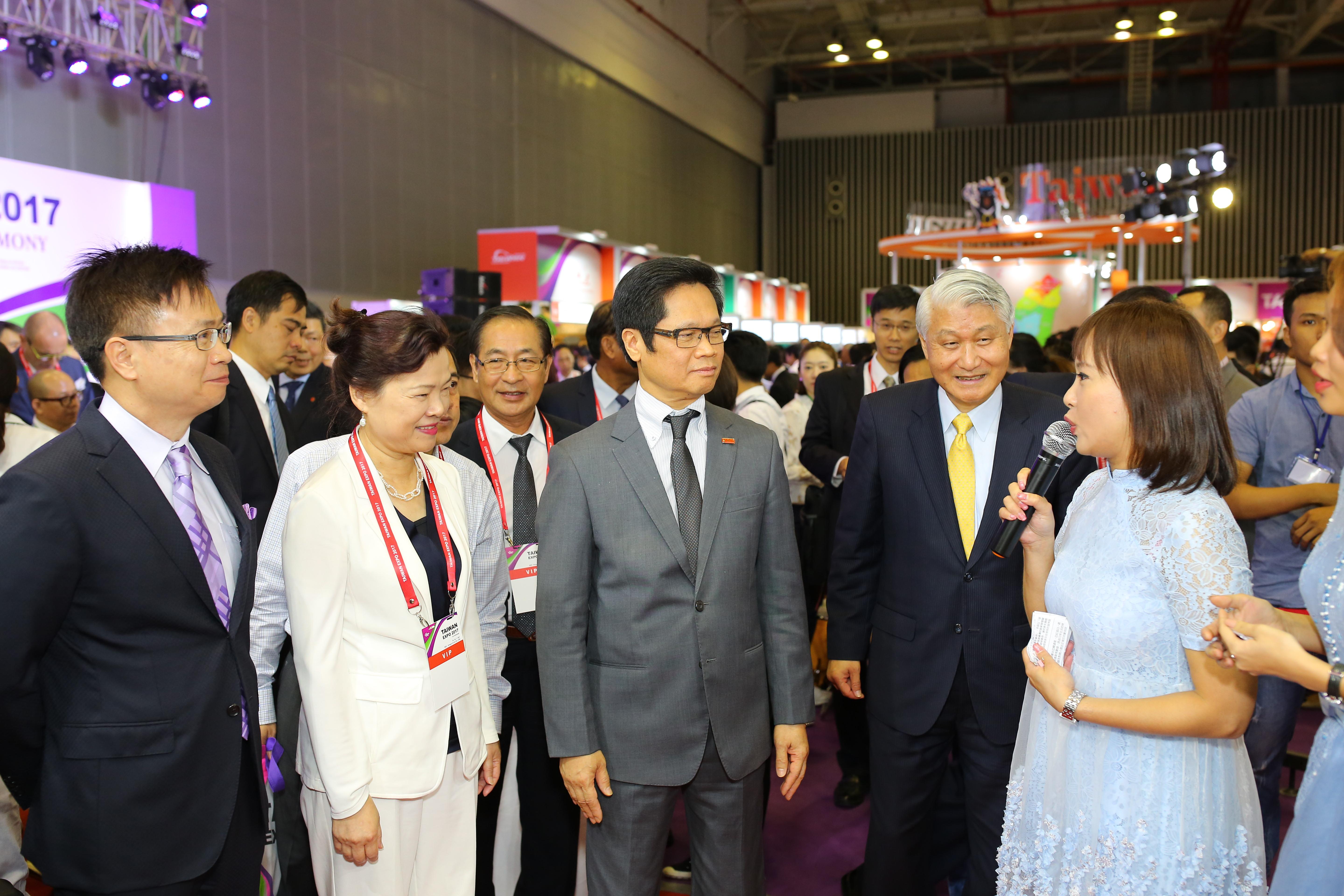 (由左至右依序為-外貿協會黃董事長志芳、經濟部王次長美花、越南商工總會武主席進祿、本處石大使)