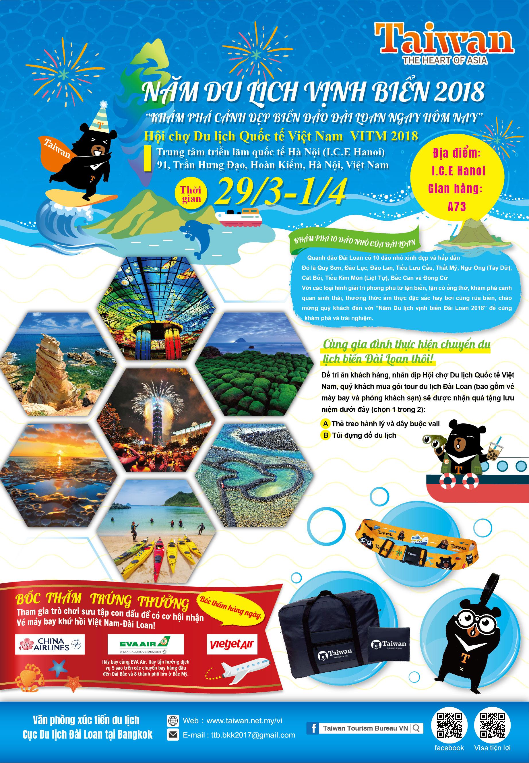 Để giúp mọi người hiểu rõ hơn về Đài Loan, cảm nhận sức sống Đài Loan, Cục Du lịch Đài Loan đã mời đoàn nghệ thuật Zero Four và nghệ sĩ biểu diễn Bóng bay vui vẻ (Happy Balloons) đến biểu diễn tại Hội chợ Du lịch Quốc tế Việt Nam VITM , thông qua các tiết mục biểu diễn sẽ khiến khán giả có thể cảm nhận nét đẹp văn hóa của Đài Loan. Ngoài ra, tại gian triển lãm của Cục Du lịch Đài Loan, khách tham quan còn có thể thưởng thức chè thạch chanh Alishan, cùng chơi con quay - trò chơi truyền thống của trẻ em Đài Loan, tự làm con ve trúc, lắp đèn lồng và các hoạt động thú vị khác… Bên cạnh đó, để khuyến khích du khách Việt Nam đi du lịch Đài Loan, trong thời gian diễn ra hội chợ, khách mua gói tour du lịch Đài Loan trực tiếp tại hội chợ sẽ được Cục Du lịch Đài Loan tặng một món quà thú vị. Số lượng quà tặng có hạn, sẽ được phát cho đến hết.