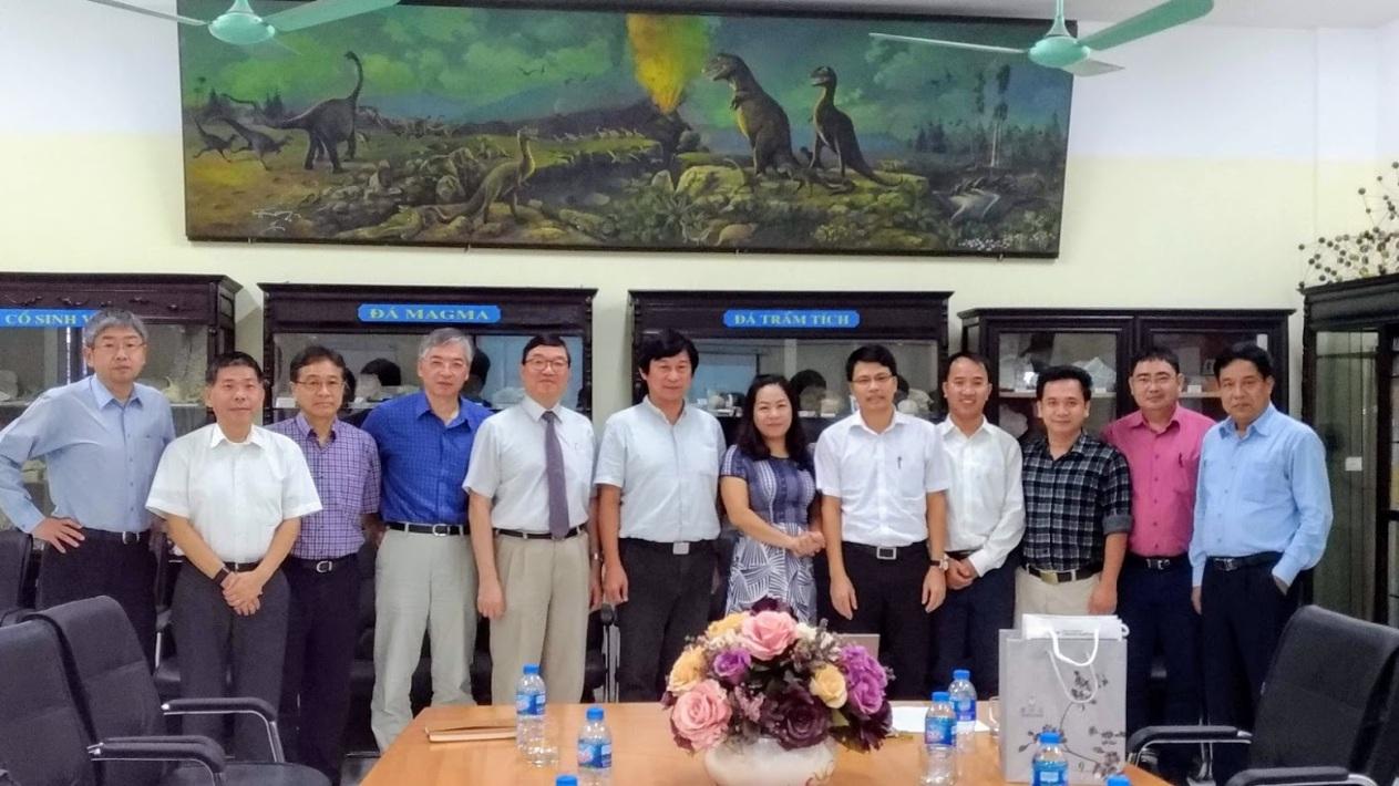 Dưới sự hỗ trợ sắp xếp của Phòng Khoa học - Văn phòng Kinh tế và Văn hóa Đài Bắc tại Việt Nam, đoàn công tác gồm GS. Wen-Yen Chang (ngoài cùng bên trái) – Đại học Đông Hoa, GS. Chau Chang Wang (thứ hai từ trái sang) – Giám đốc Trung tâm nghiên cứu Hải dương Đài Loan, GS. Jong Dao Jou (thứ ba từ trái sang) – Khoa Khí tượng Đại học quốc lập Đài Loan, GS. Shu Kun Hsu (thứ tư từ trái sang) – Đại học Trung ương Đài Loan và GS. Bor Shouh Huang (giữa) – Viện nghiên cứu trung ương Đài Loan, đã có buổi thăm và làm việc với Khoa Địa chất, Đại học khoa học tự nhiên Hà Nội. Trưởng Khoa Đinh Xuân Thành và các giảng viên của Khoa địa chất chụp ảnh lưu niệm cùng đoàn.