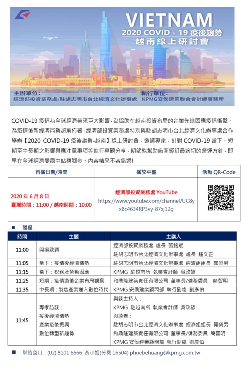 【2020 COVID-19疫後趨勢-越南】線上研討會 首播日期: 2020年6月8日 臺灣時間:11:00/越南時間:10:00 播放平台: 經濟部投資業務處YouTube