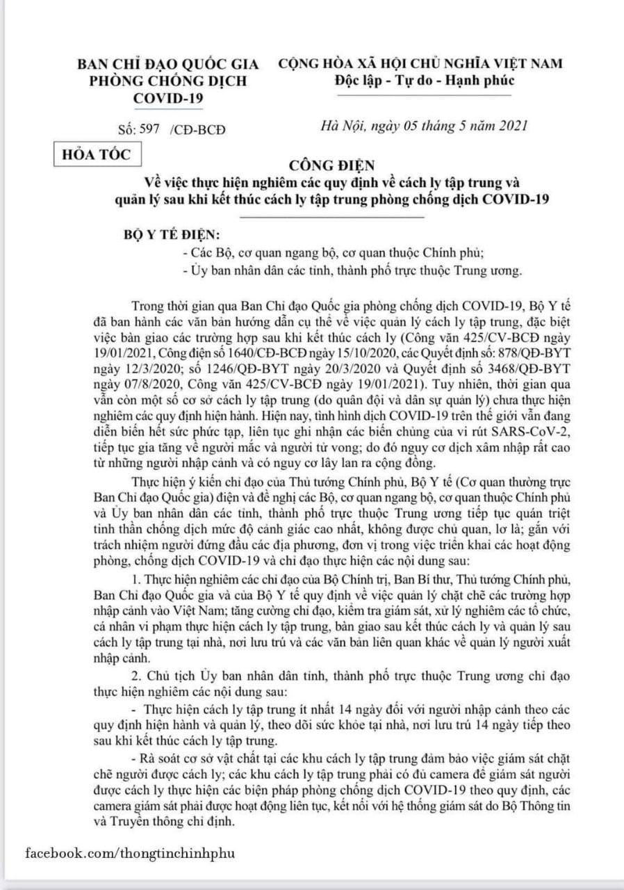 越南國家防疫指導委員會2021/5/5第597 /CD-BCĐ號公文