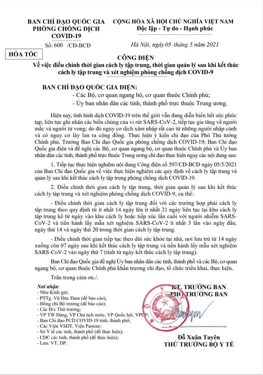 依據2021年5月5日越南國家防疫指導委員會第600/CD-BCD號公文: