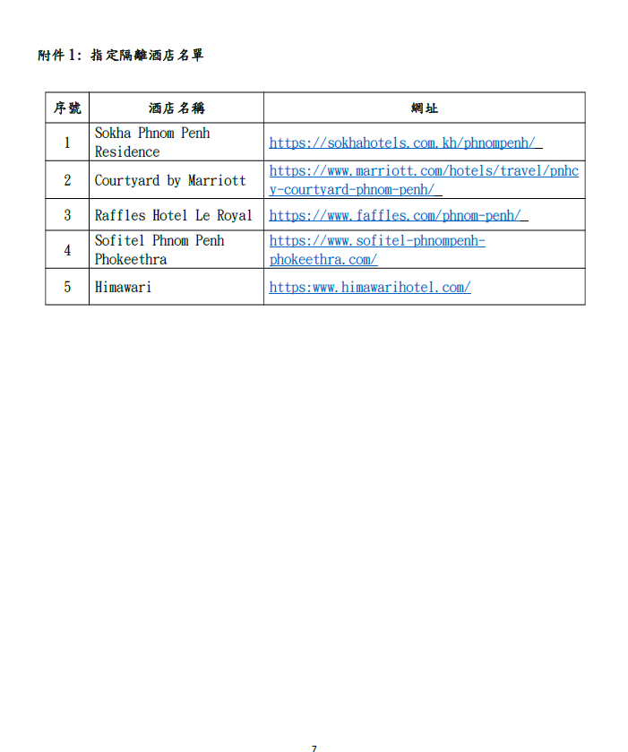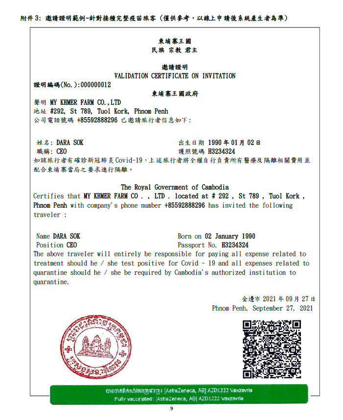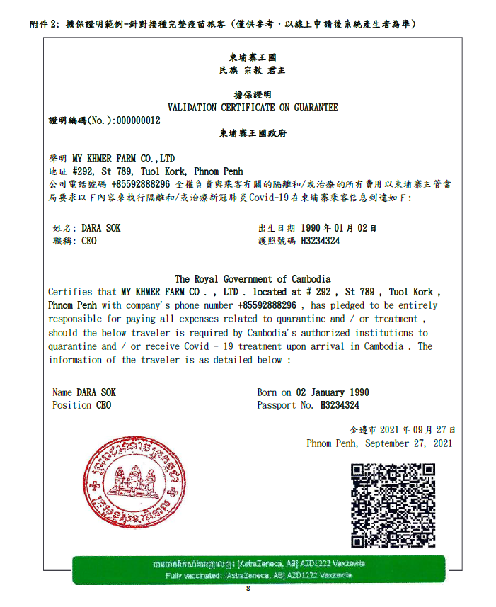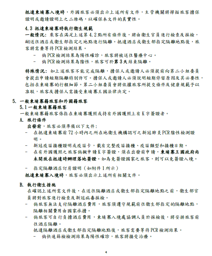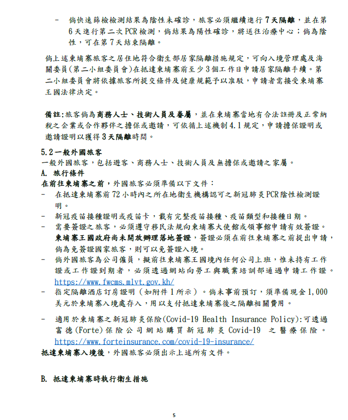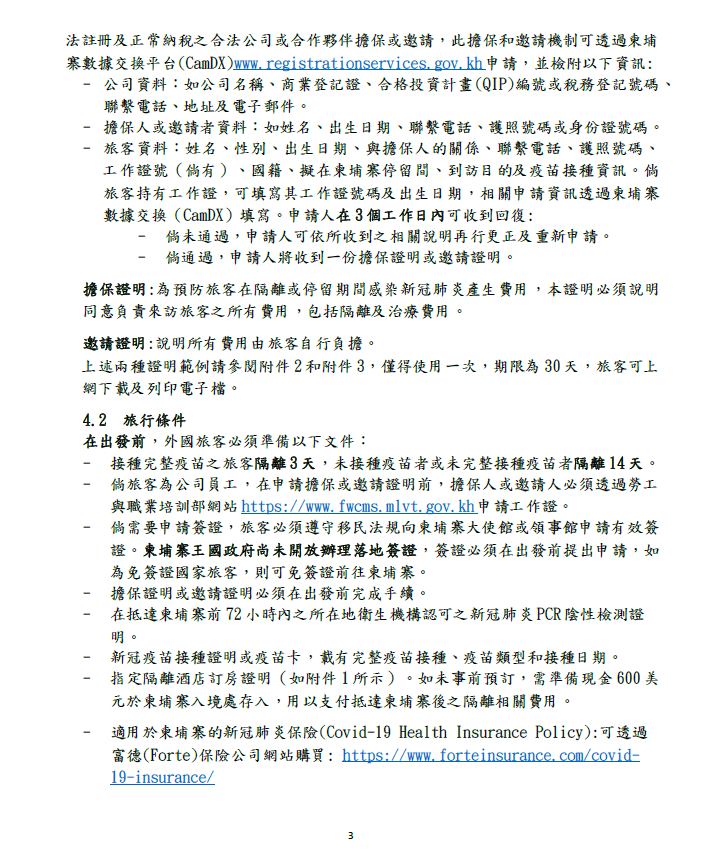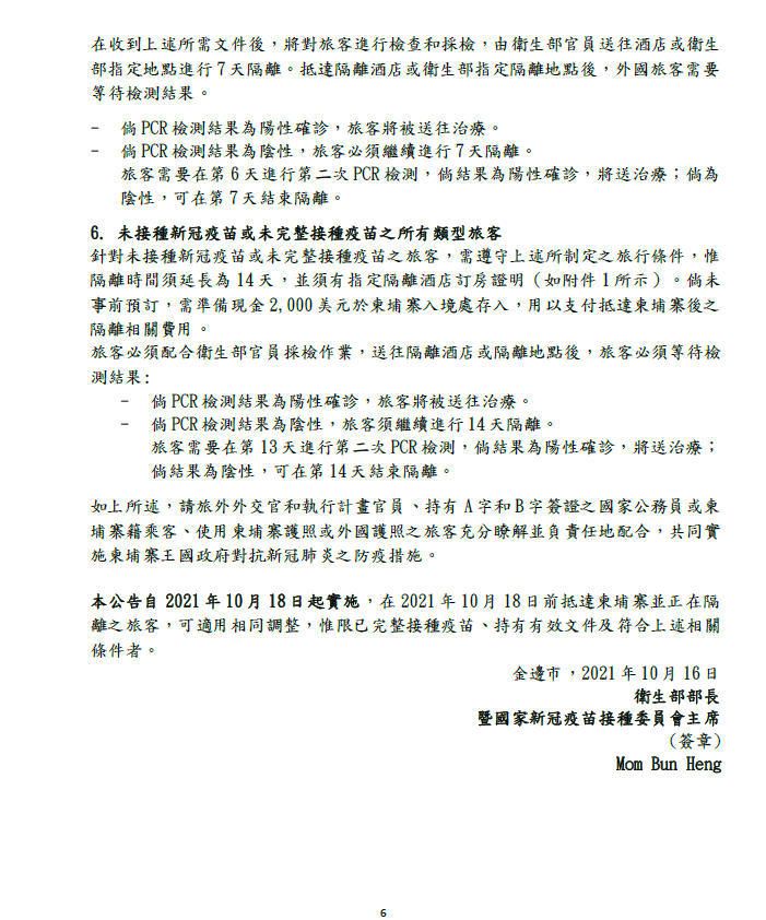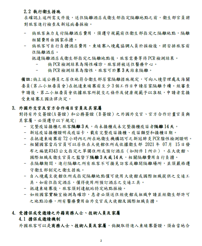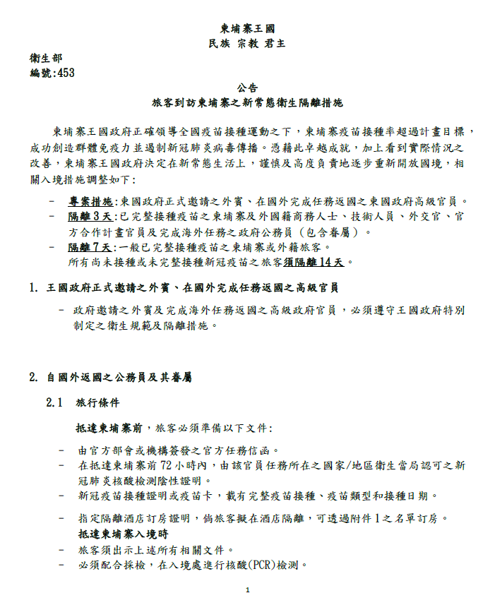 柬埔寨政府本(110)年10月16日發布公告(中譯文請詳附件),調整入境隔離相關措施:針對獲得擔保或邀請並已完成新冠疫苗接種(2劑)之商務人士,入境後僅需隔離3天;已完成接種疫苗之普通旅客(包括柬埔寨人或外國人),隔離時間減至7天;未完整接種新冠疫苗(2劑)者則仍需隔離14天。