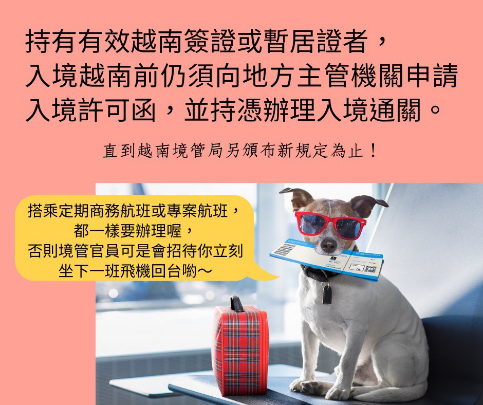 經洽詢越南入出境主管機關表示,由於定期航班仍在試行階段,目前對於外國人入境申請手續及准許入境對象(目的)均未有新規定,在有新規定公佈之前,仍須依現行辦法申請入境許可,准許入境對象亦維持限外交或公務目的、投資者或經營管理人、高技術勞工及其眷屬、外國留學生等對象。 因此,目前搭乘定期商務航班入境的非越南籍旅客,即使已持有有效簽證或暫居證,仍然需要由擔保公司/人向各地人委會申請批准公文,並據以至入出境管理局辦理入境許可函。入境時倘無相關文件,極有可能有在機場被移民官員拒絕入境,遭遣返回台。 請國人搭機前特別注意,除了有效簽證或暫居證、疫苗接種證明(以越南認可廠牌為準)、搭機前72小時RT-PCR陰性檢測證明、健康申報表等必備文件外,記得一定要於行前取得地方人委會批准公文和境管局入境許可函,直到另有新規定為止。 此為越南政府為防堵疫情經過長期關閉國境後,在達到超過90% 18歲以上人口兩劑疫苗覆蓋率的背景下嘗試對外開放的第一步。相信未來在入境航點、入境手續、准許入境對象,甚至是隔離檢疫措施,都會視疫情與境內群體免疫能力等綜合考量下逐步調整擴大和放寬,希望國人能耐心配合。未來若有任何新規定,本處會在第一時間盡快公告周知,請大家密切注意本處臉書和網站訊息。