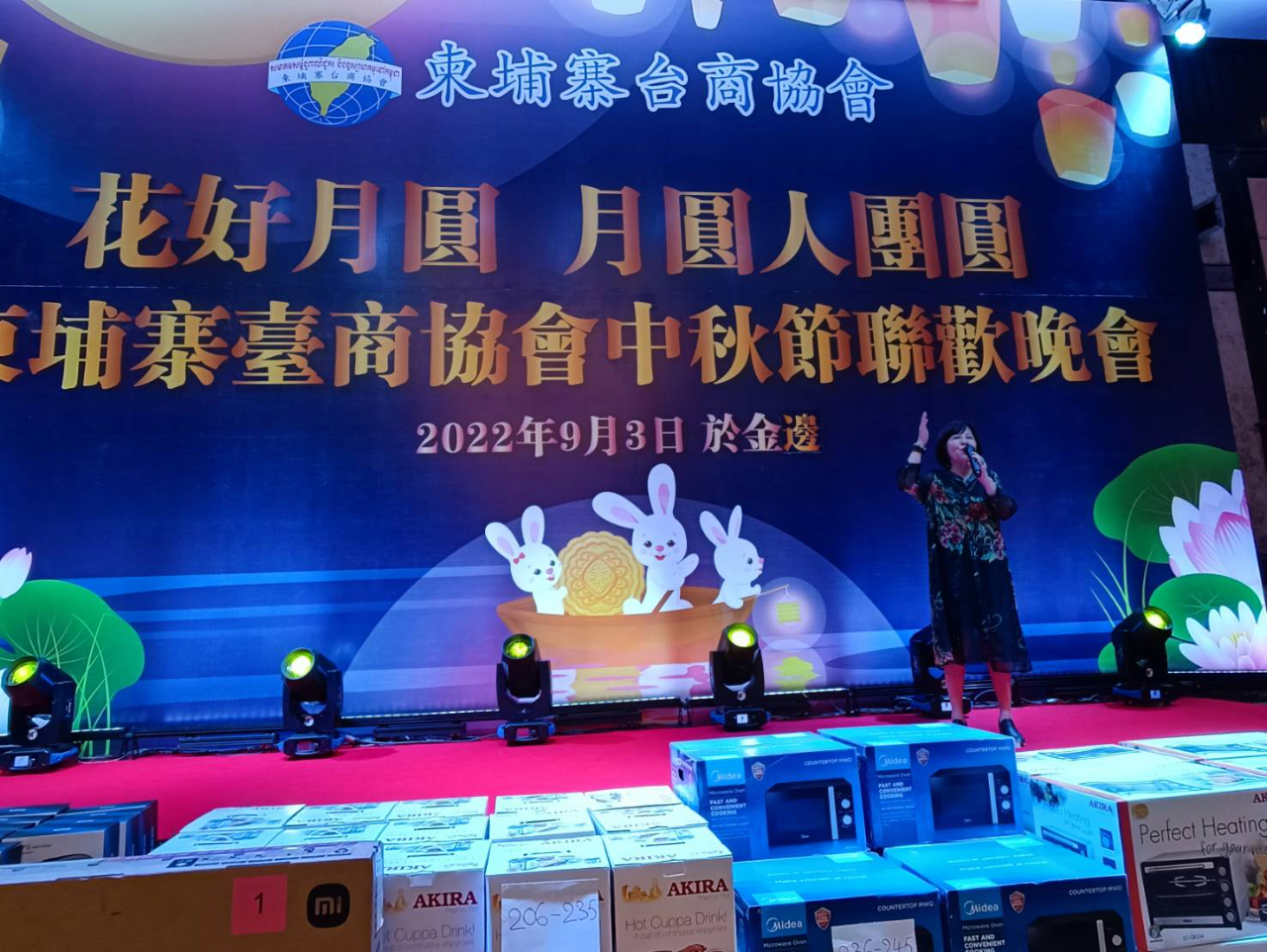 柬埔寨臺商協會於9月3日晚上在柬埔寨金邊市明星機場飯店舉辦「花好月圓月圓人團圓」中秋聯歡晚會,由會長張南蘋主持,駐胡志明市辦事處處長韓國耀偕組長黃煥松、警務秘書林岳賢、移民秘書林銀姿、僑務秘書何雨畊等同仁應邀出席,柬埔寨僑務委員張清水、僑務諮詢委員江永興、葉詩卉、僑務顧問蔡宜晉、高哲雄、陳克捷、黃資貽、柬埔寨灣客家聯誼會會長劉建佑、貿協駐金辦事處主任林正大、該會輔導會長王美蕙、理監事及商會會員400多人齊聚一堂,共同歡慶中秋。