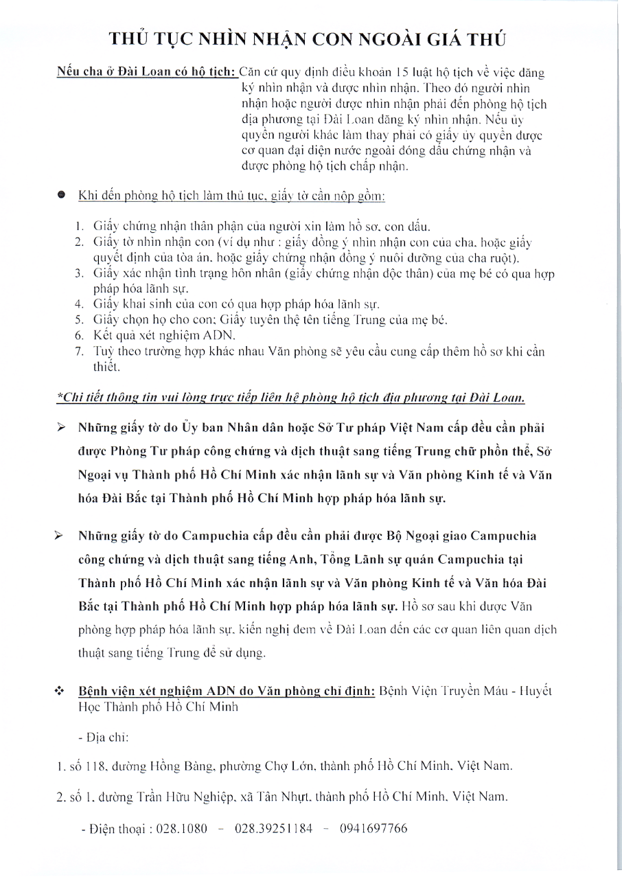國人辦理認領與外國籍單身女子所生之非婚生子女 - 參考 (THỦ TỤC ĐĂNG KÝ NHÌN NHẬN CON NGOÀI GIÁ THÚ)