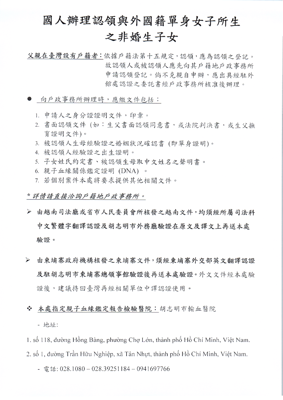 國人辦理認領與外國籍單身女子所生之非婚生子女 - 參考 (THỦ TỤC ĐĂNG KÝ N... - 駐胡志明市台北經濟文化辦事處 Taipei Economic and Cultural Office in Ho Chi Minh City ::: 跳到主要內容區塊