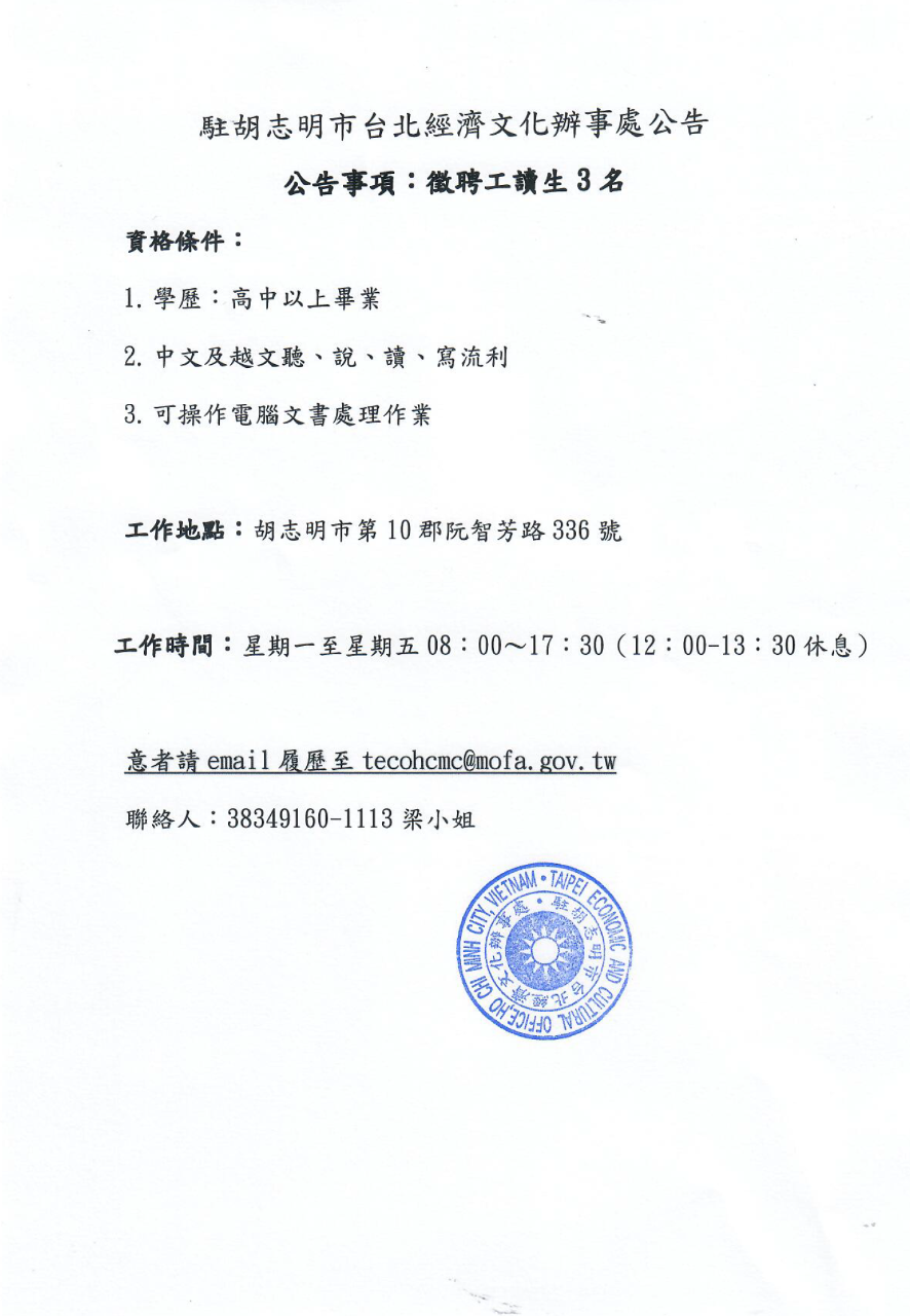 公告:本處徵聘工讀生3名 - 駐胡志明市台北經濟文化辦事處 Taipei Economic and Cultural Office in Ho Chi Minh City ::: 跳到主要內容區塊