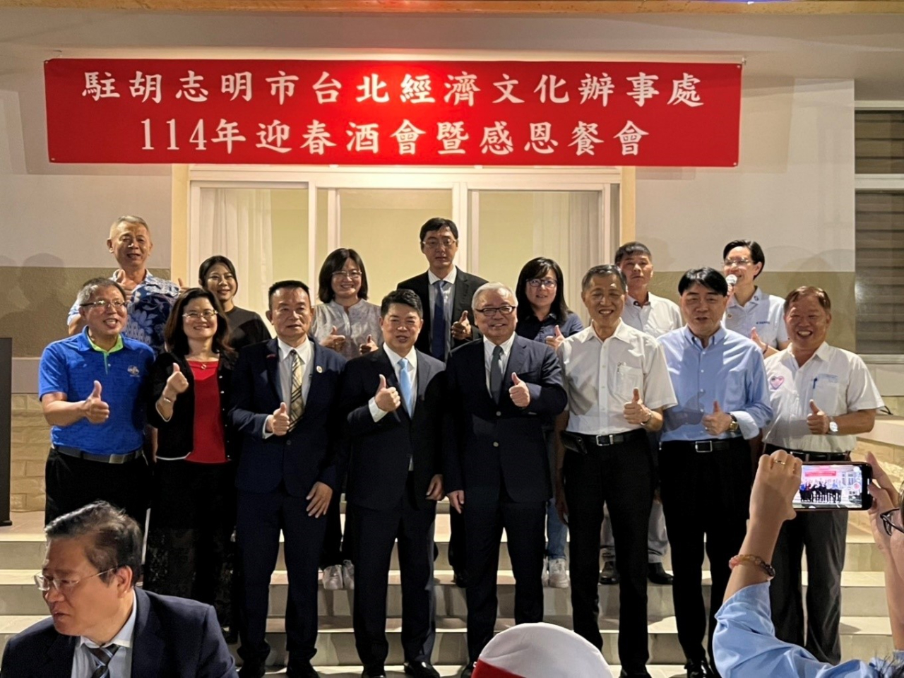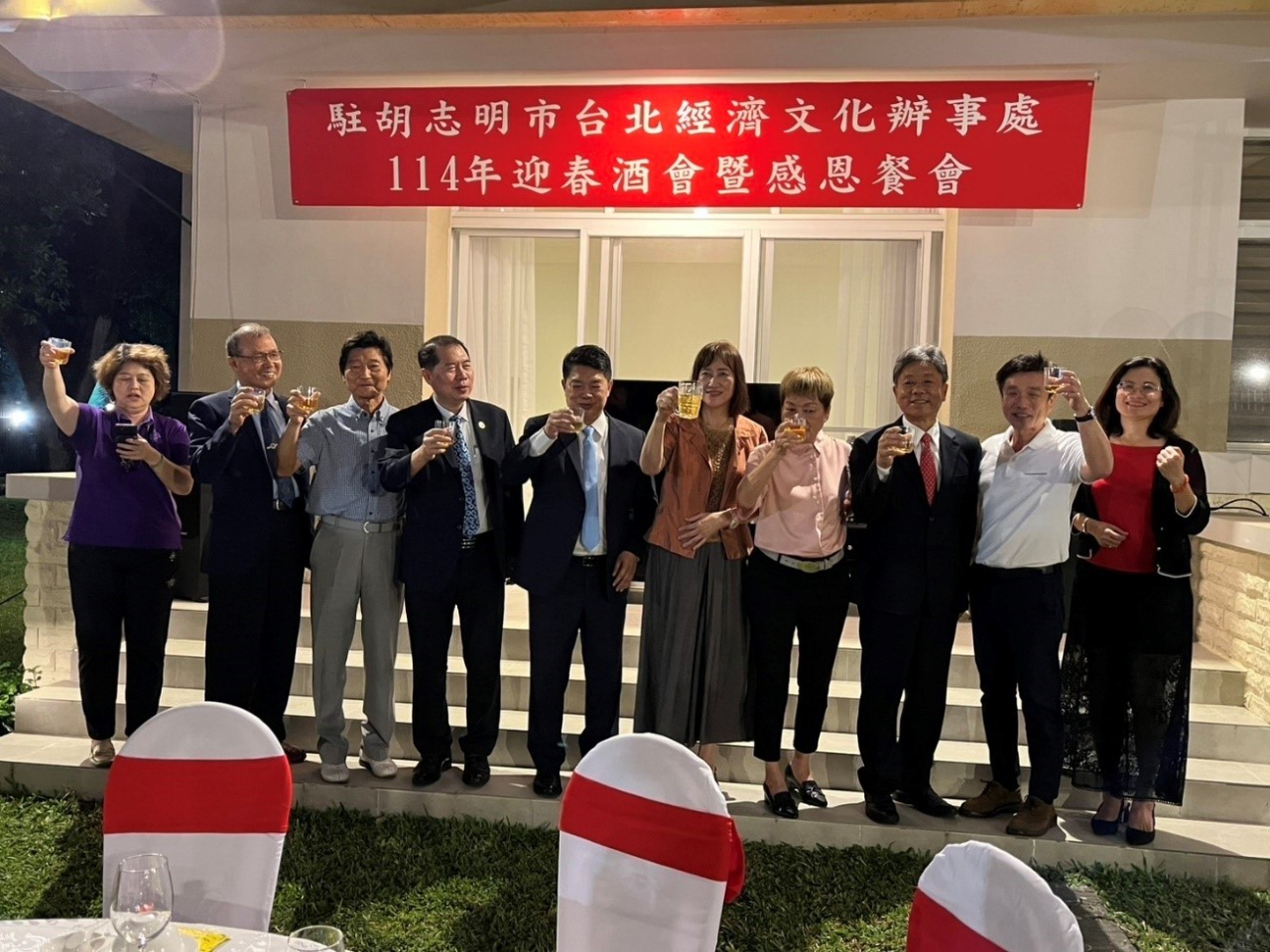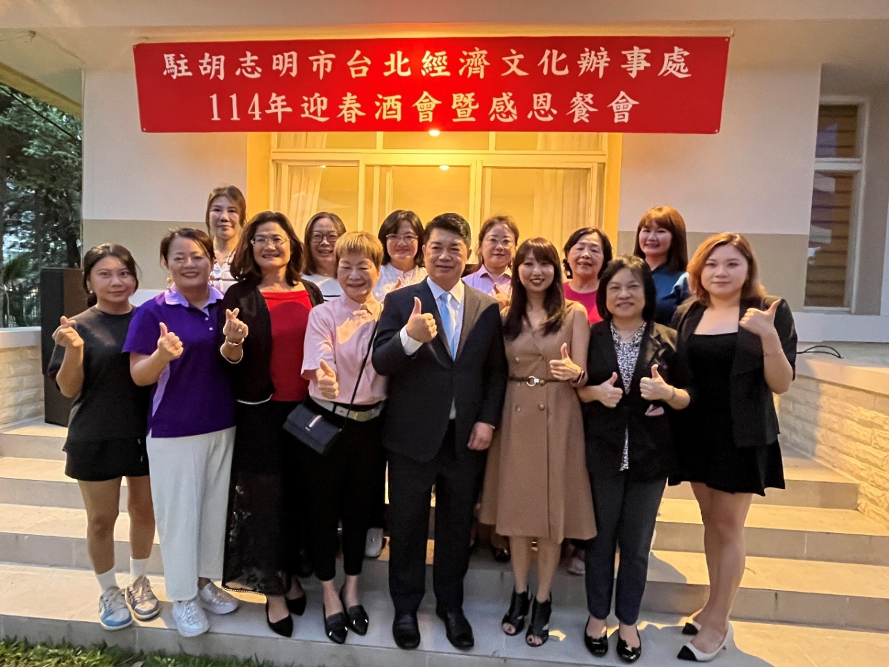駐胡志明市台北經濟文化辦事處韓國耀處長於3月21日(星期五)晚間在職務宿舍舉辦「114年迎春酒會暨感恩餐會」,席開20桌,分別來自南越地區及柬埔寨僑務榮譽職之僑領、越南台灣商會聯合總會、10個台商分會、柬埔寨台商協會、越南及柬埔寨台灣客家聯誼會、越南僑界關懷救助協會、世華婦女會越南分會、青商會、越南彰化同鄉會、越南碳中和科技聯盟、自行車業聯誼會、台灣學校、越華國際學校、金融、保險與航空業者、越南台商高爾夫大聯盟及8支球隊、家具聯盟公會、巧聖廟、越南留台校友會及相關台資企業負責人等各界嘉賓與本處同仁歡聚一堂,分享這個溫馨美好的時刻,共度歡樂愉悅的春酒盛宴。