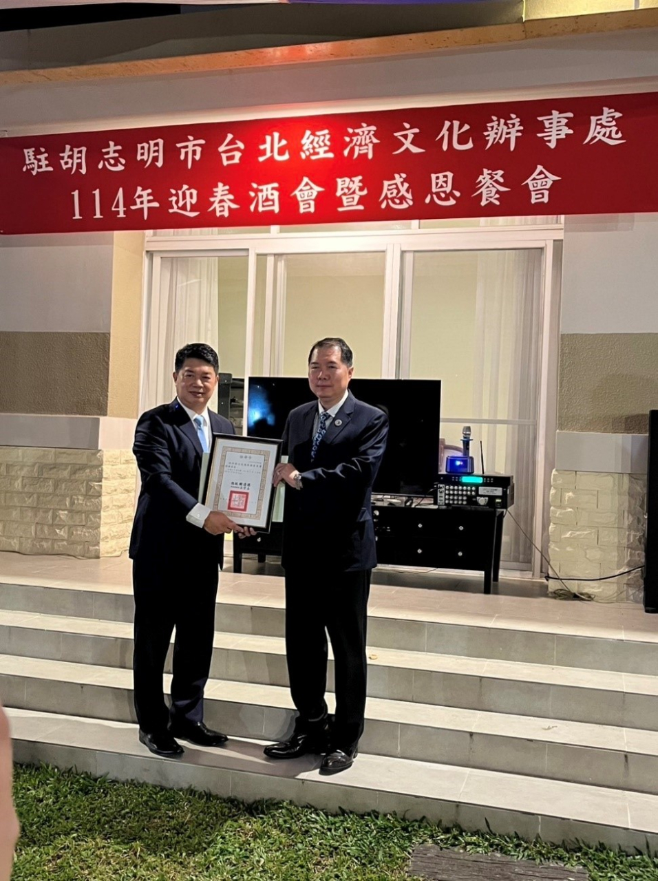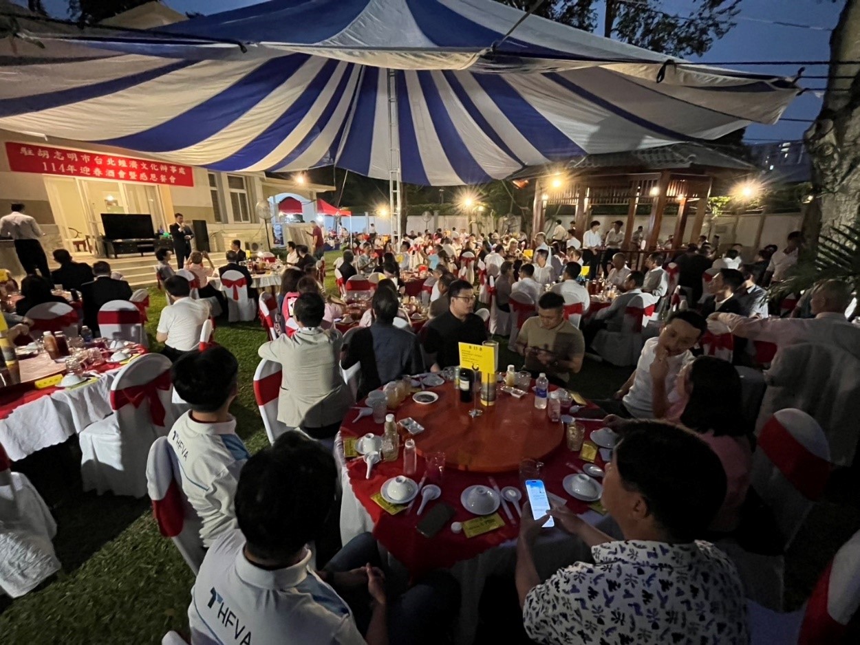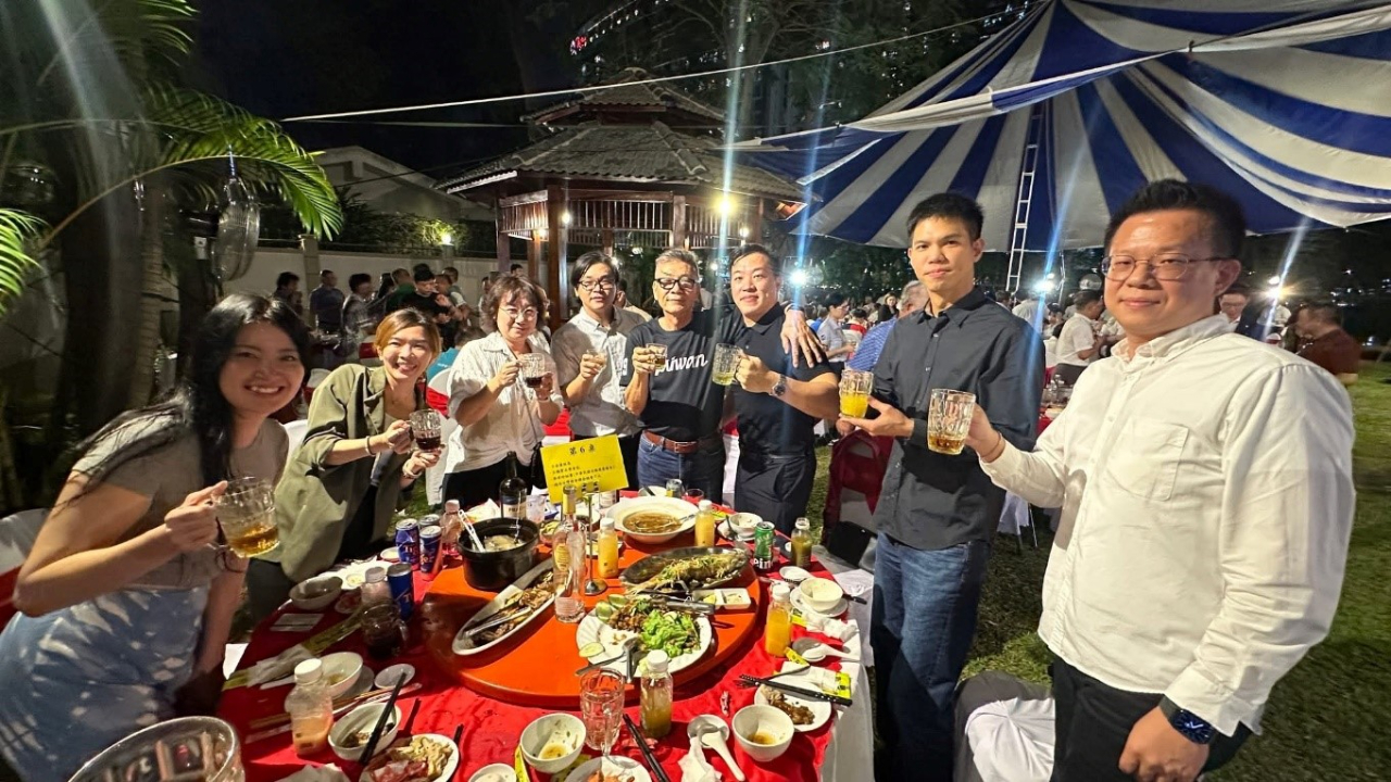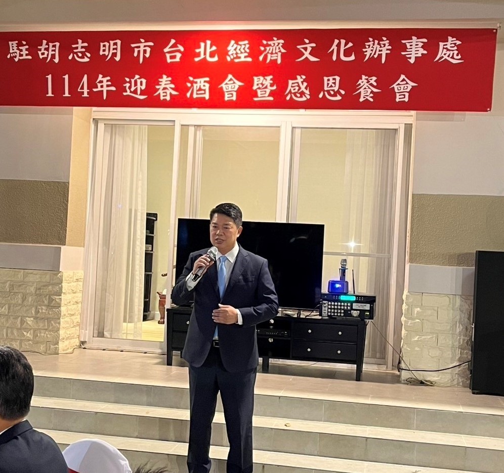 駐胡志明市台北經濟文化辦事處韓國耀處長於3月21日(星期五)晚間在職務宿舍舉辦「114年迎春酒會暨感恩餐會」,席開20桌,分別來自南越地區及柬埔寨僑務榮譽職之僑領、越南台灣商會聯合總會、10個台商分會、柬埔寨台商協會、越南及柬埔寨台灣客家聯誼會、越南僑界關懷救助協會、世華婦女會越南分會、青商會、越南彰化同鄉會、越南碳中和科技聯盟、自行車業聯誼會、台灣學校、越華國際學校、金融、保險與航空業者、越南台商高爾夫大聯盟及8支球隊、家具聯盟公會、巧聖廟、越南留台校友會及相關台資企業負責人等各界嘉賓與本處同仁歡聚一堂,分享這個溫馨美好的時刻,共度歡樂愉悅的春酒盛宴。