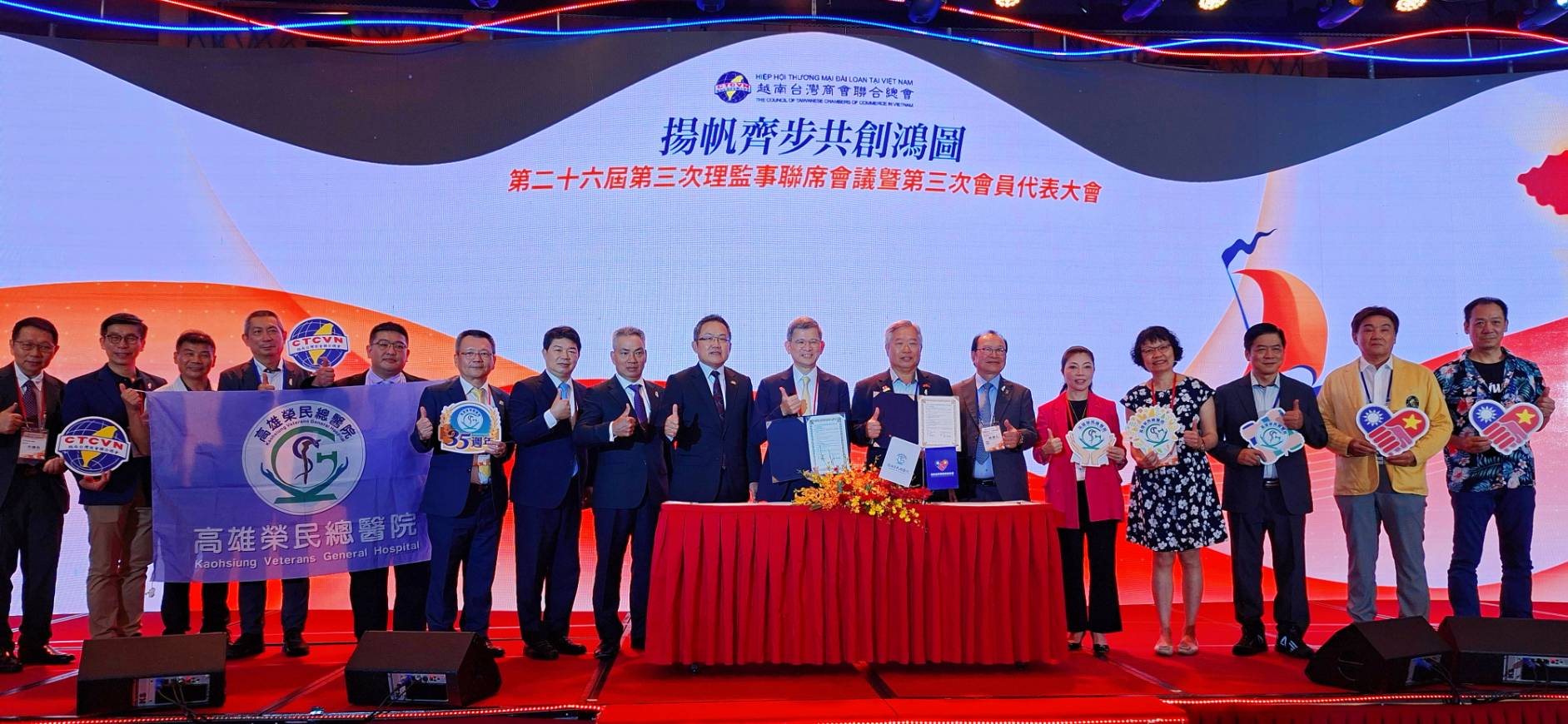 越南臺灣商會聯合總會代表大會於 9 月 13 及14 日在峴港盛大舉行,由總會長袁濟凡主持,駐越南代表處劉大使世忠應邀致詞,本處韓處長國耀亦偕相關同仁出席。現場貴賓包括僑務榮譽職人員、駐地僑領、亞洲臺灣商會聯合總會總會長及監事長、立法委員鍾佳濱等約300人共襄盛舉,場面熱烈。
