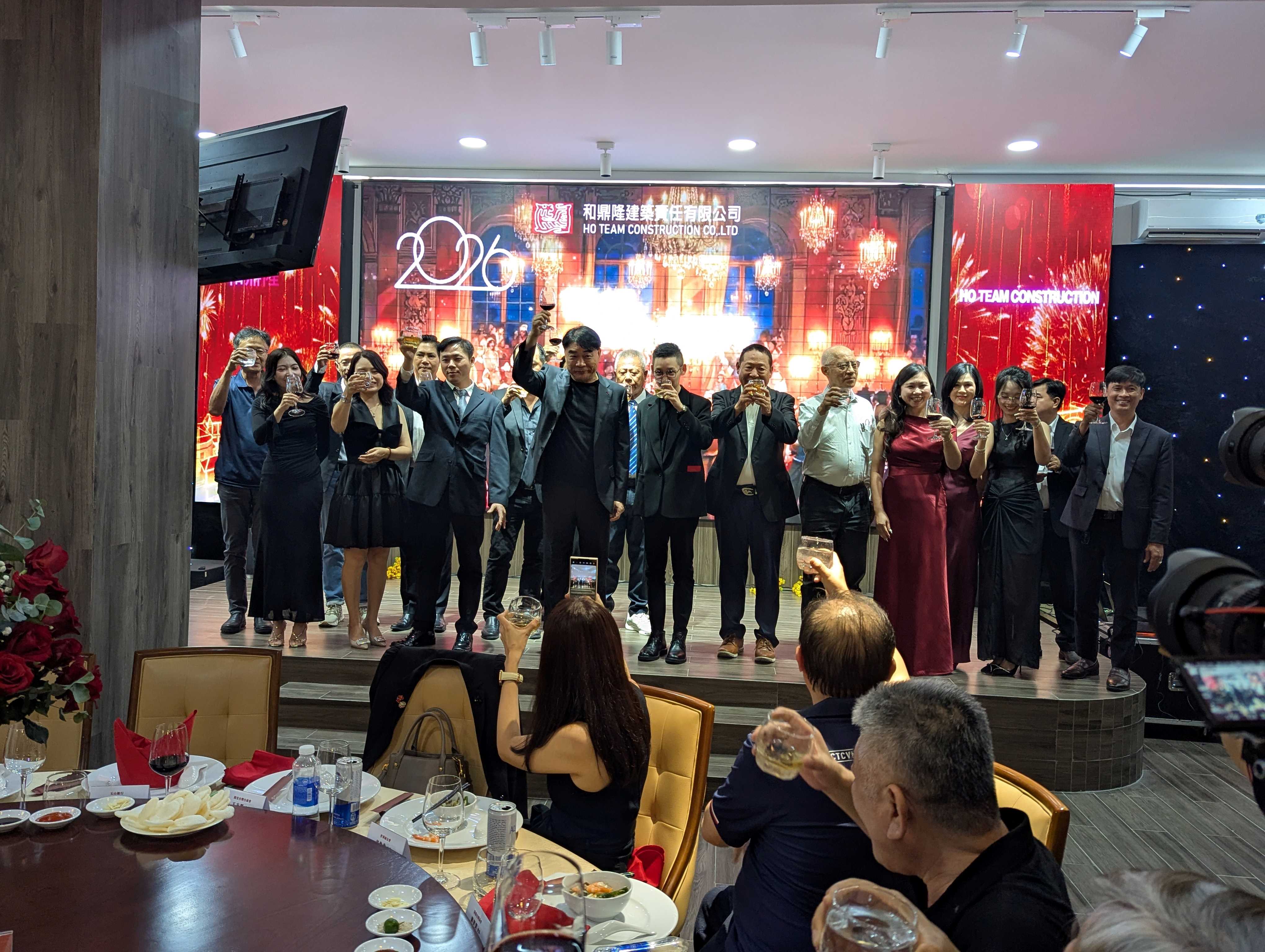 和鼎隆建築責任有限公司於2026年2月10日在同奈省總公司宴會廳舉辦年終尾牙感恩餐會,本處韓處長國耀偕同仁應邀到場祝賀。晚會由董事長簡智明主持,簡董事長致詞感謝股東、員工及各界支持,並介紹公司治理及關懷社會之企業文化,獲現場來賓一致好評。