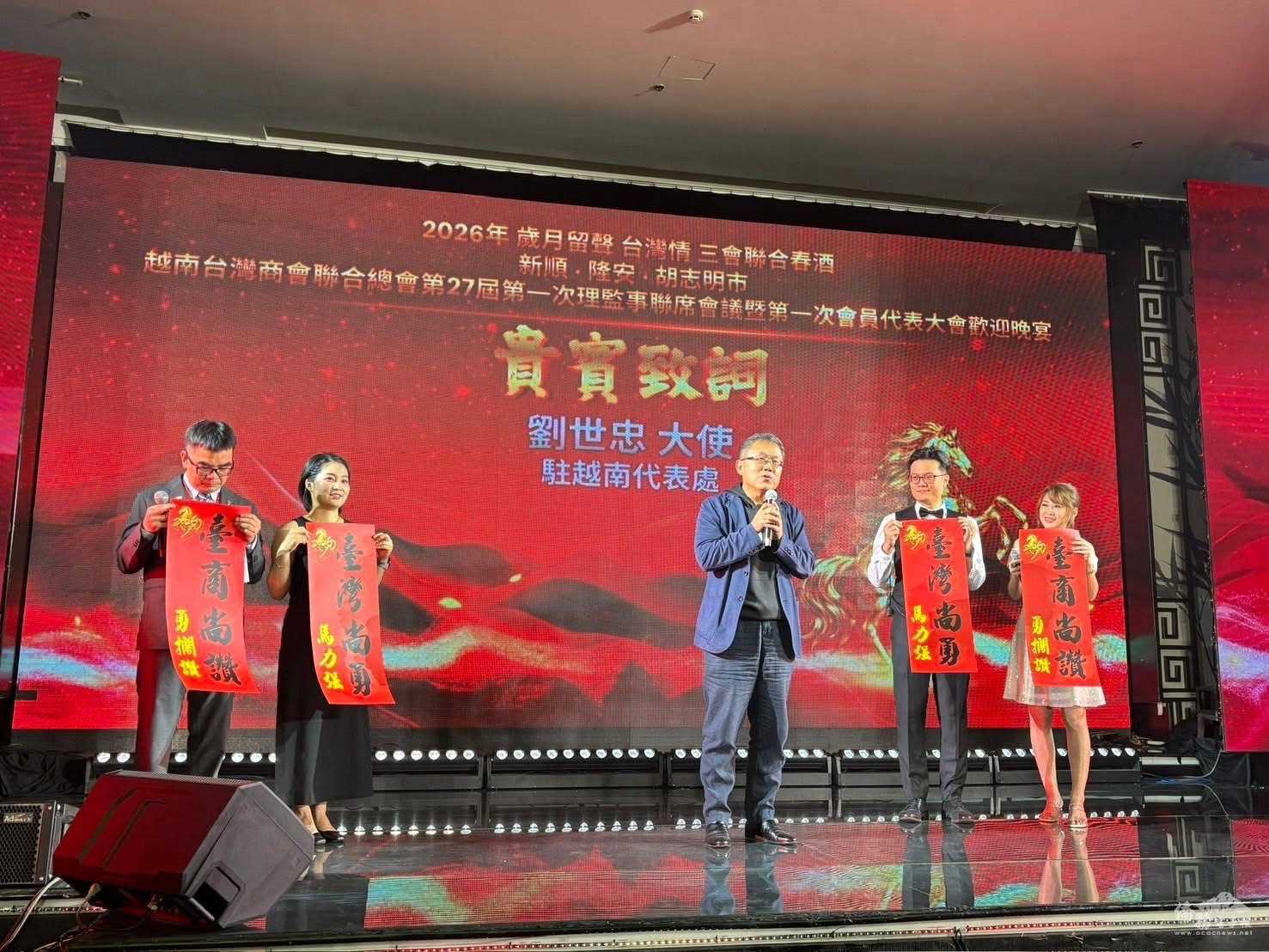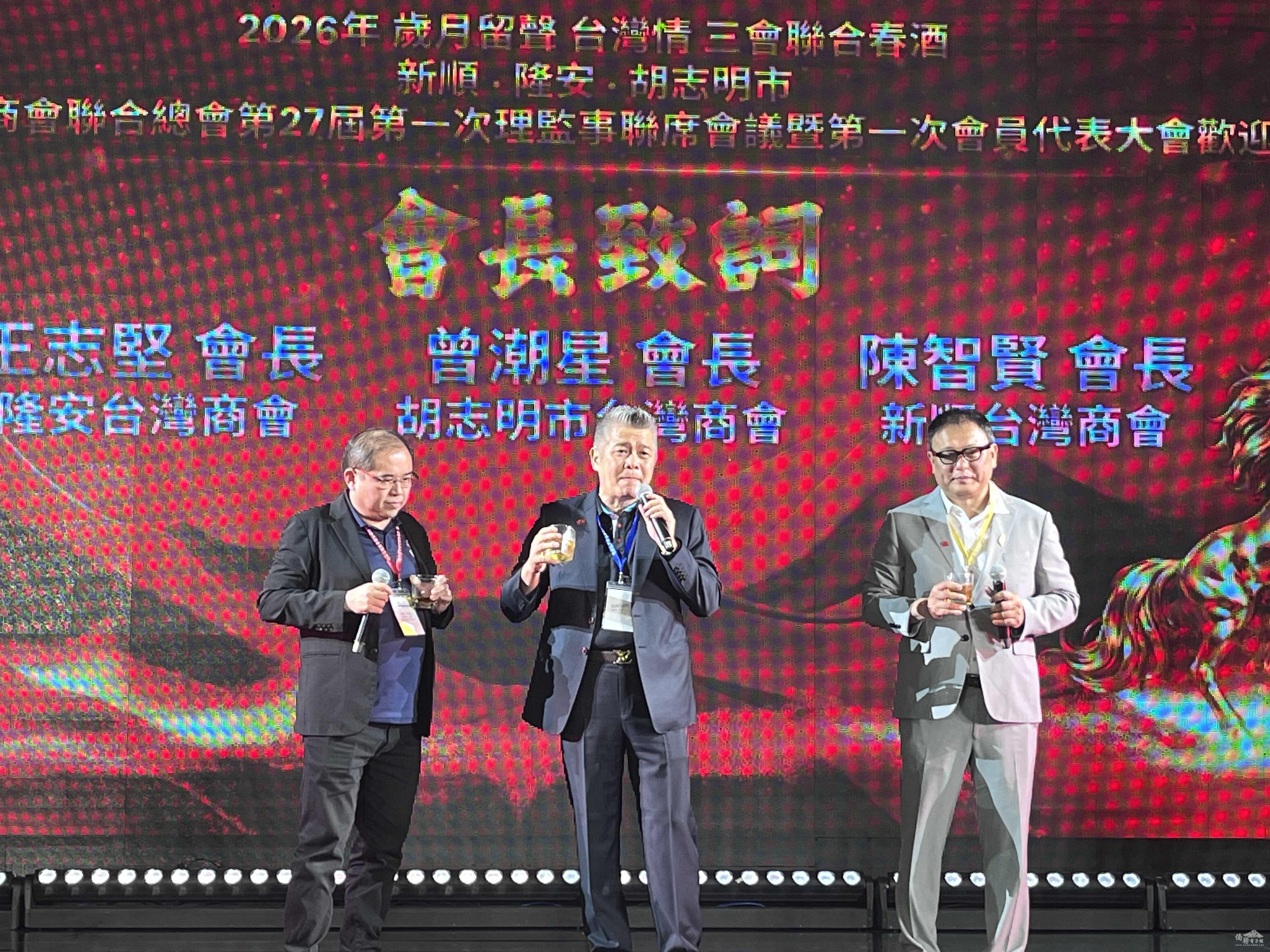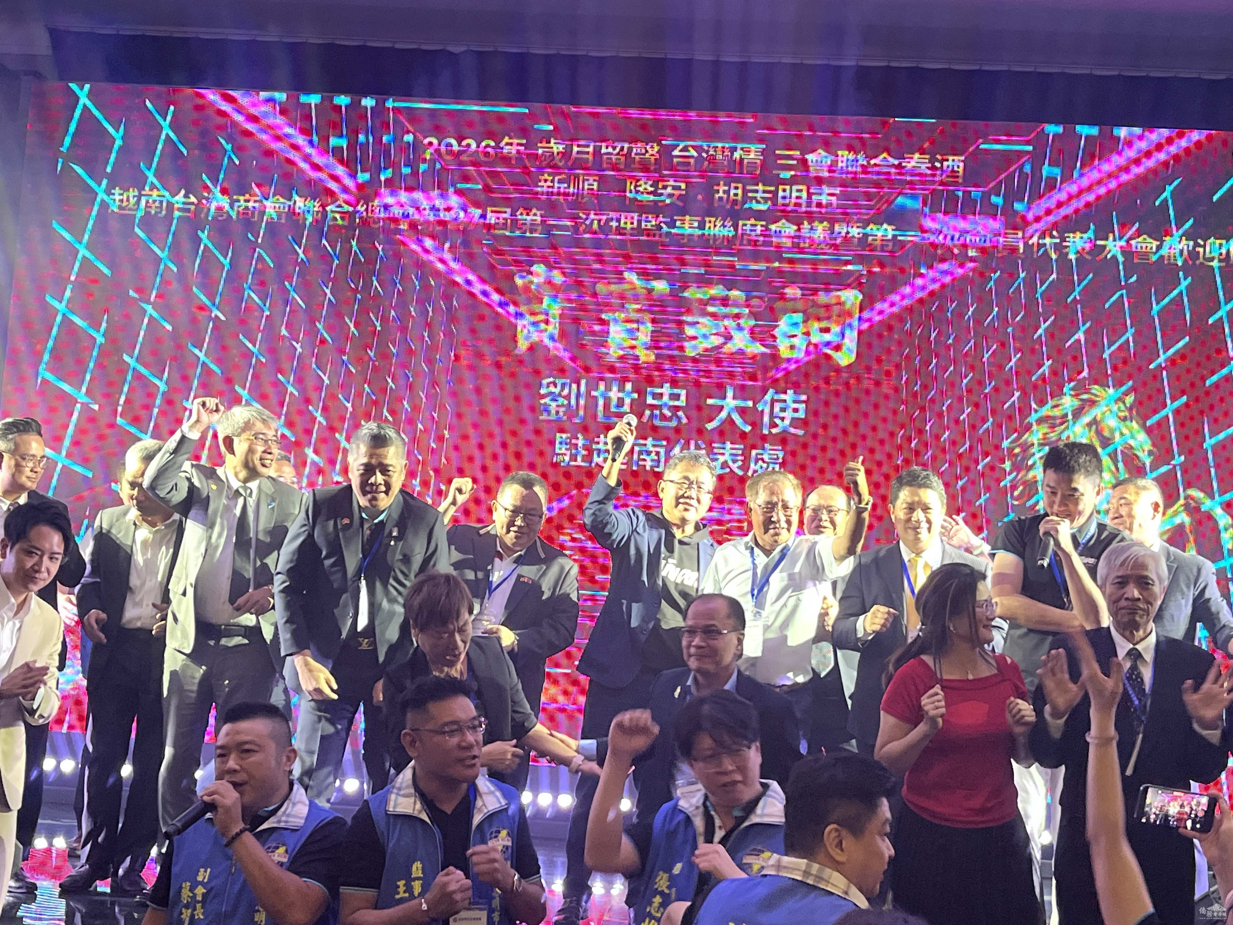 越南胡志明、新順及隆安三臺灣商會於2026年3月21日聯合舉辦春酒晚宴,以「歲月留聲臺灣情」為主題,首度攜手合辦大型活動。駐越南代表處大使劉世忠親臨祝賀,本處韓處長國耀亦偕同仁到場祝賀。與會佳賓包括立法委員黃健豪、徐巧芯、羅智強、廖先翔、羅廷瑋、前海基會秘書長高建智,以及在地僑領僑務委員蔡文瑞、謝明輝、吳明穎、林淑莉、友會夥伴、企業代表共逾800人共襄盛舉,展現海外臺商大團結氣氛,場面熱烈。
