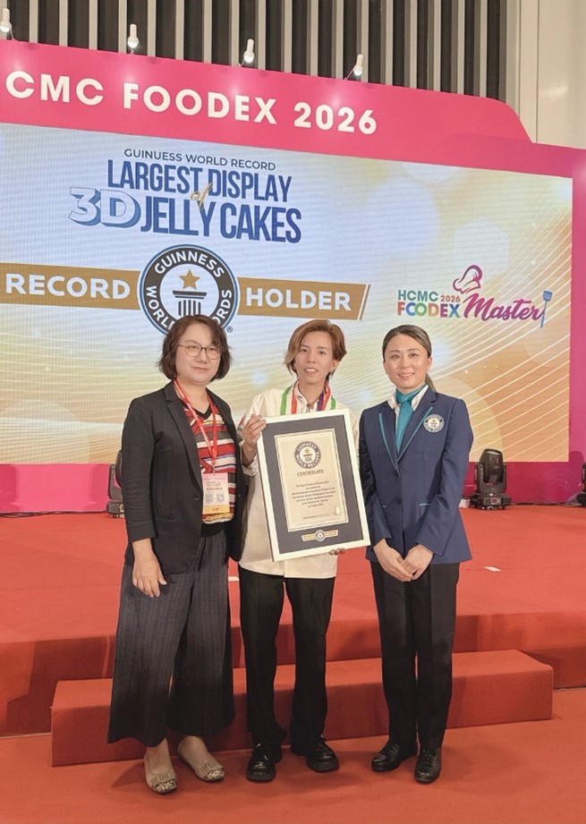 「國際果凍藝術發展協會(IJA)」率領台灣果凍藝術代表隊於2026年4月15日在越南胡志明市舉辦之「世界烘焙暨甜品藝術大賽」中,順利挑戰「1198顆藝術果凍花」金氏世界紀錄成功。本處王副處長金蘭特別於當日抵達會場,除了為台灣果凍藝術代表隊加油鼓勵,同時見證及祝賀我國團隊挑戰世界紀錄成功!