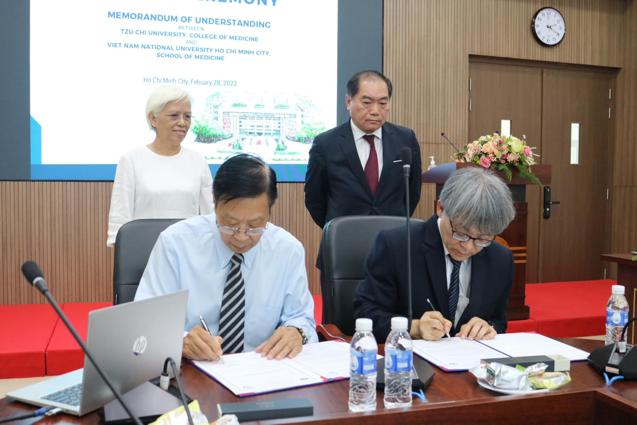 28/02/2023, Ông Trần Hòa Hiền (phía sau bên phải), Trưởng phòng Giáo duc Văn phòng Kinh tế và Văn hóa Đài Bắc tại TPHCM chứng kiến Lễ ký kết biên bản ghi nhớ hợp tác giáo dục giữa Khoa Y Đại học Quốc gia TPHCM và Đại học Tzu Chi (Đài Loan)