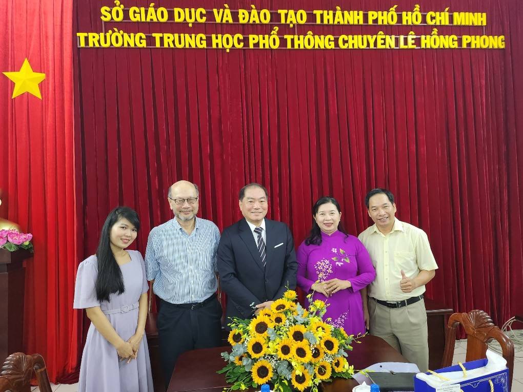 Sáng thứ Tư ngày 6/9/2023 Ông Trần Hòa Hiền (Giữa), Trưởng phòng Giáo Dục Văn phòng Kinh tế và Văn hóa Đài Bắc tại TPHCM cùng Đoàn Trường Đại học Quốc Lập ChengChi Ông Kuan Ping-Yin (Bên trái thứ 2) - Giáo Sư kiêm Trưởng phòng Chiến lược HTQT-Học viện đổi mới QT đến làm việc với BGH Trường THPT Chuyên Lê Hồng Phong (Cô Trương Thị Lệ Hà - Phó Hiệu Trưởng).
