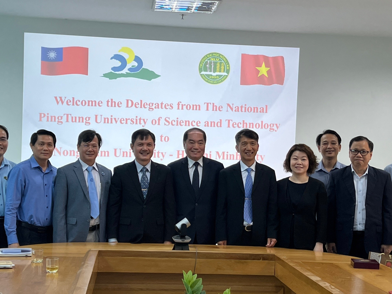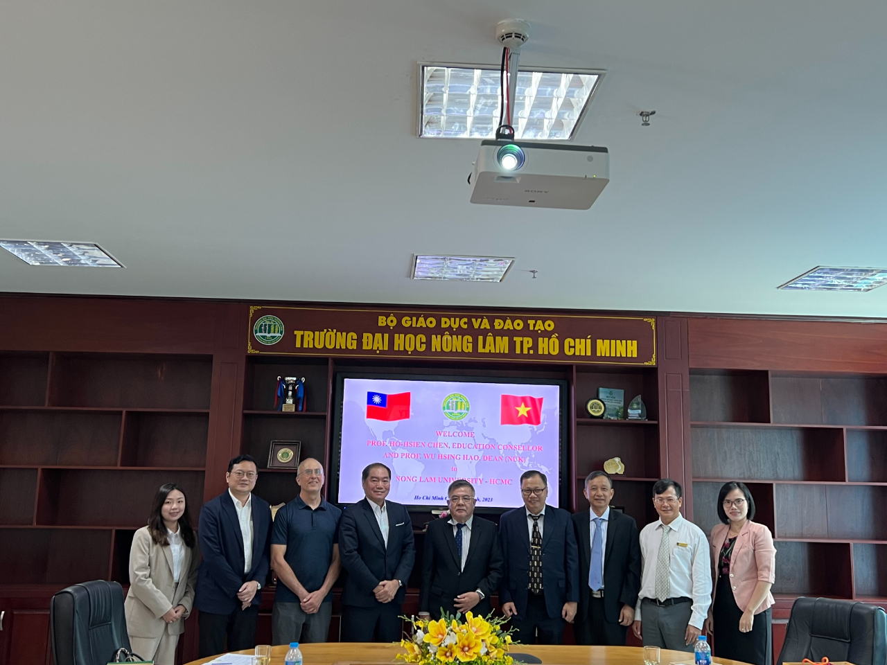 Ngày 4/4/2023 Ông Trần Hòa Hiền (giữa), Trưởng phòng Giáo duc Văn phòng Kinh tế và Văn hóa Đài Bắc tại TPHCM, GS.Yi-Yang Lien Viện trưởng Viện Thú Y trường Đại học KHKT Pingtung ( Thứ tư từ phải sang) cùng phái đoàn đến tham và làm việc trường Đại học Nông Lâm TPHCM do PGS.TS Nguyễn Tất Toàn ( Thứ tư từ trái sang) , Phó hiệu trưởng nhà trường tiếp đoàn