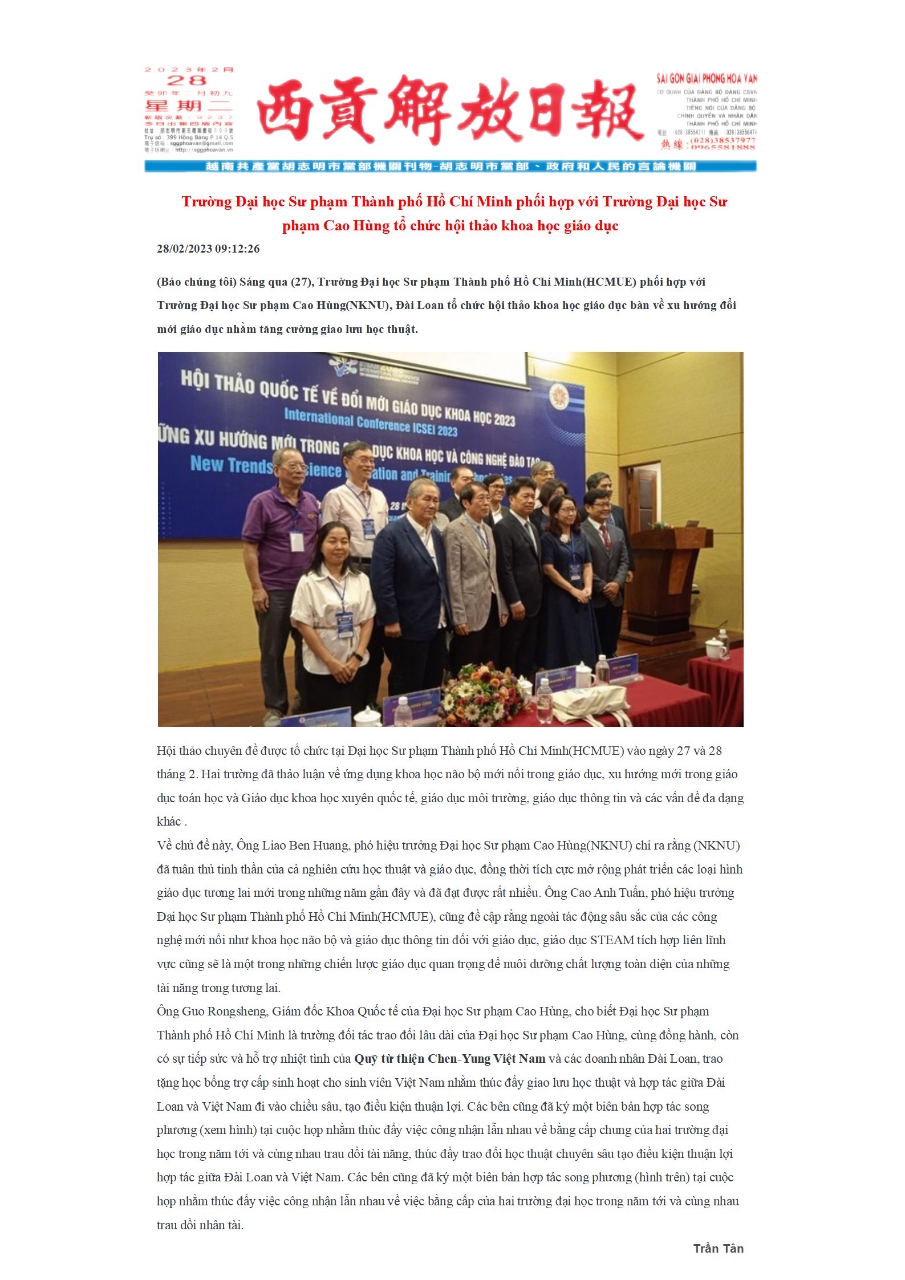 Sáng ngày 27/2/2023: Ông Hank Han-Chủ nhiệm Văn phòng Kinh tế và Văn hóa Đài Bắc tại TPHCM tham dự hội thảo quốc tế về đổi mới Giáo dục Khoa học năm 2023 chủ đề “Những xu hướng mới trong Giáo dục Khoa học và Công nghệ Đào tạo” do trường Đại học Sư Phạm TPHCM phối hợp trường Đại học Sư phạm Quốc lập Cao Hùng tổ chức