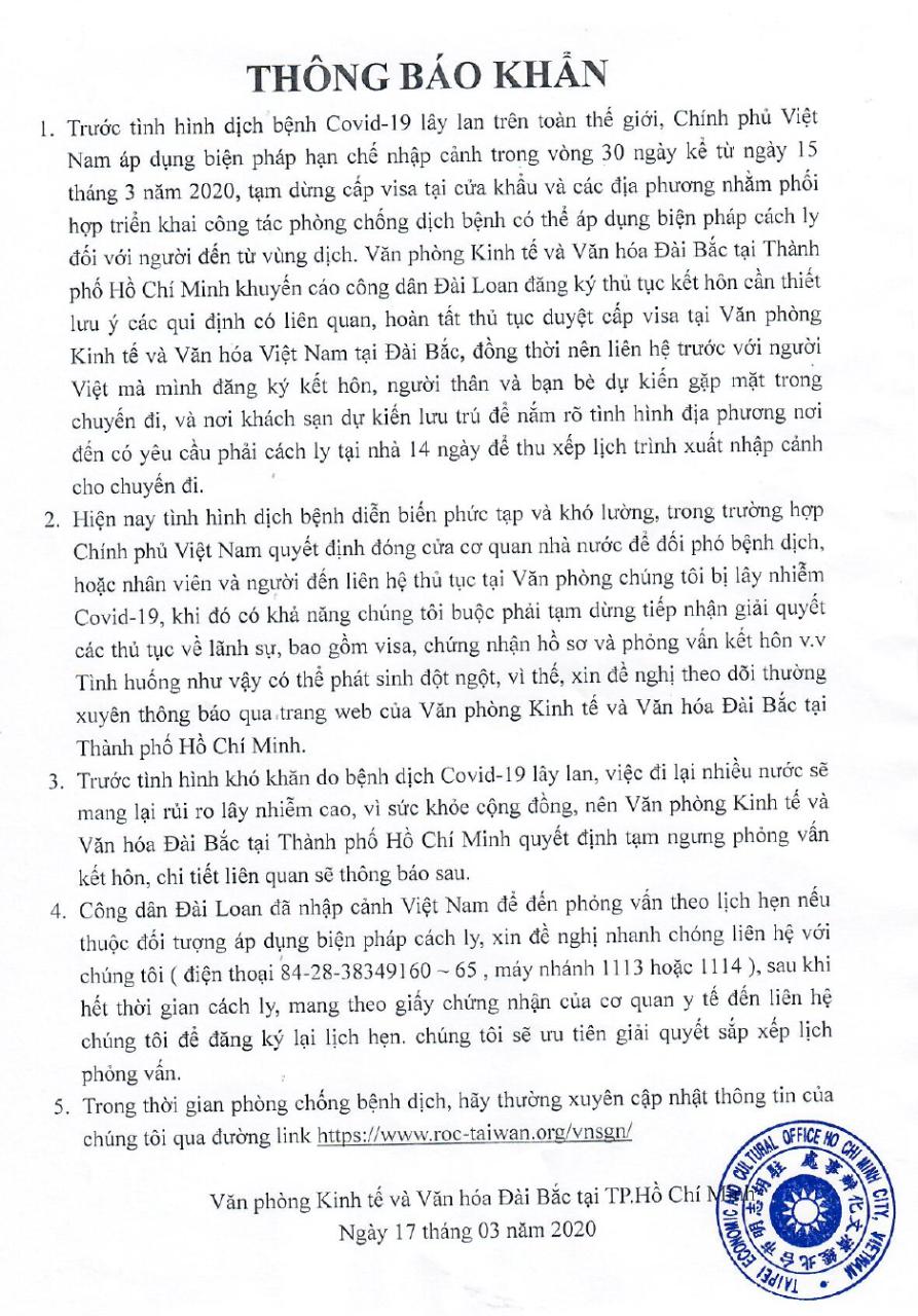 Thông Báo Khẩn - Văn Phòng Kinh Tế và Văn Hóa Đài Bắc tại TP. Hồ Chí Minh 駐胡志明市台北經濟文化辦事處 :::