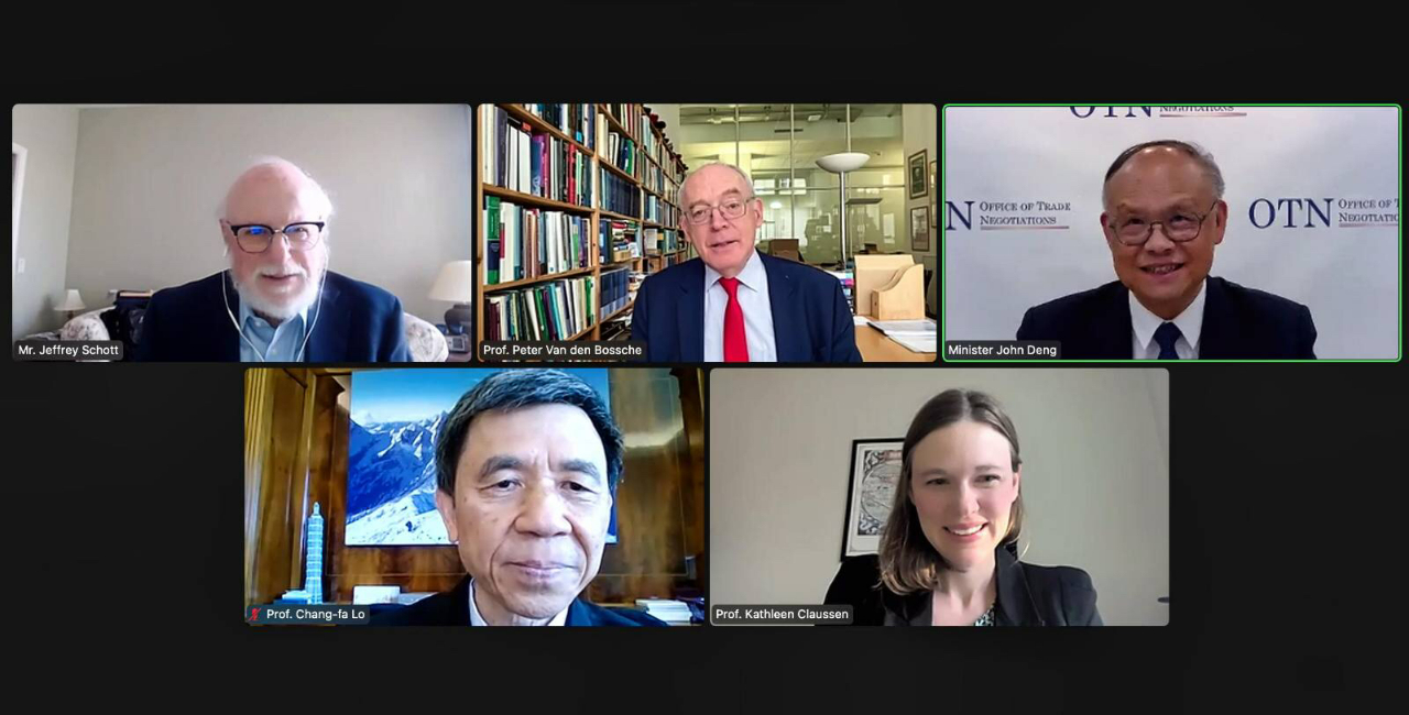 本團與世界貿易研究所(WTI)合辦"強化台美經濟及政治關係:台美21世紀貿易倡議"線上研討會,講座有鄧政務委員政中(右上)、本團羅大使昌發(左下)、美國喬治城大學Kathleen Claussen法學教授(右下)及彼得森國際經濟研究所Jeffrey Scott高級研究員(左上),主持人為WTI教授 Peter Van den Bossche(上中)