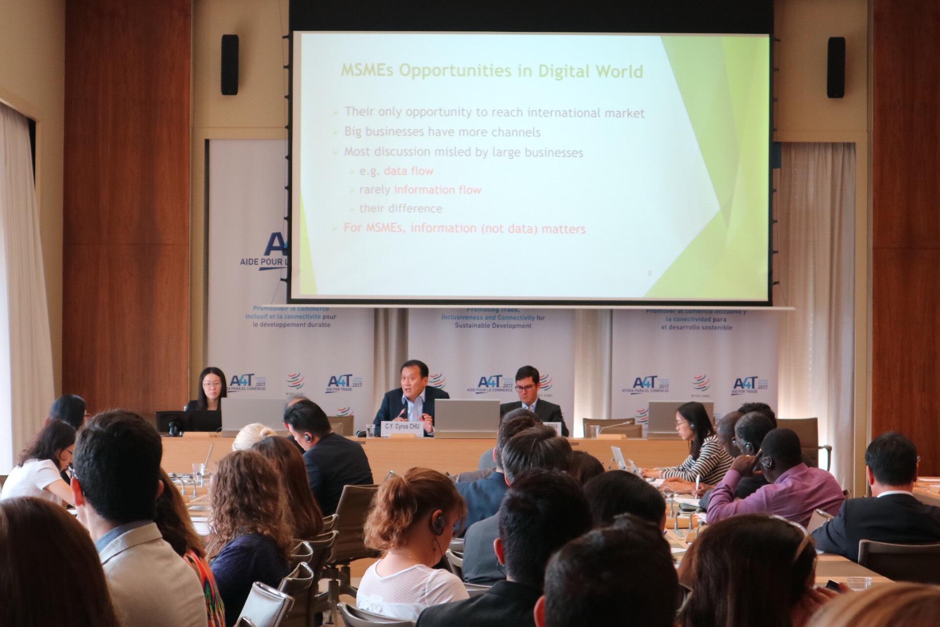 WTO每兩年舉辦一次「貿易援助全球檢視大會」,本(2017)年會議於7月11日至13日在WTO日內瓦總部舉行,會議主題為「促進貿易與連結—達成永續發展」,與會各國代表均認為「電子商務」為加強「貿易與連結」之重要利器,呼籲開發中國家及低度開發國家善用電子商務,以協助脫貧、婦女就業及扶植中小企業,將有助在2030年前完成聯合國「永續發展目標」(Sustainable Development Goals)。