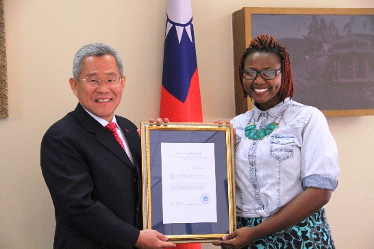 Representative Pei-yung Hsu hands the scholarship to Ms Mandisa Sophline Mditshwa