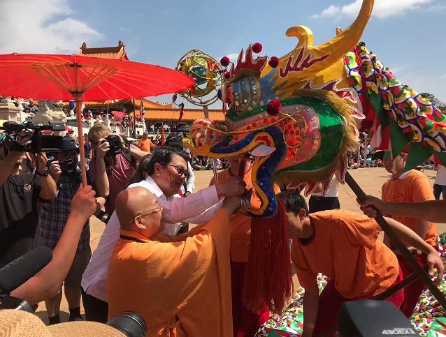 周代表唯中與南華寺導師依淳法師共同向龍首獻上「三陽開泰」的大紅包祈福
