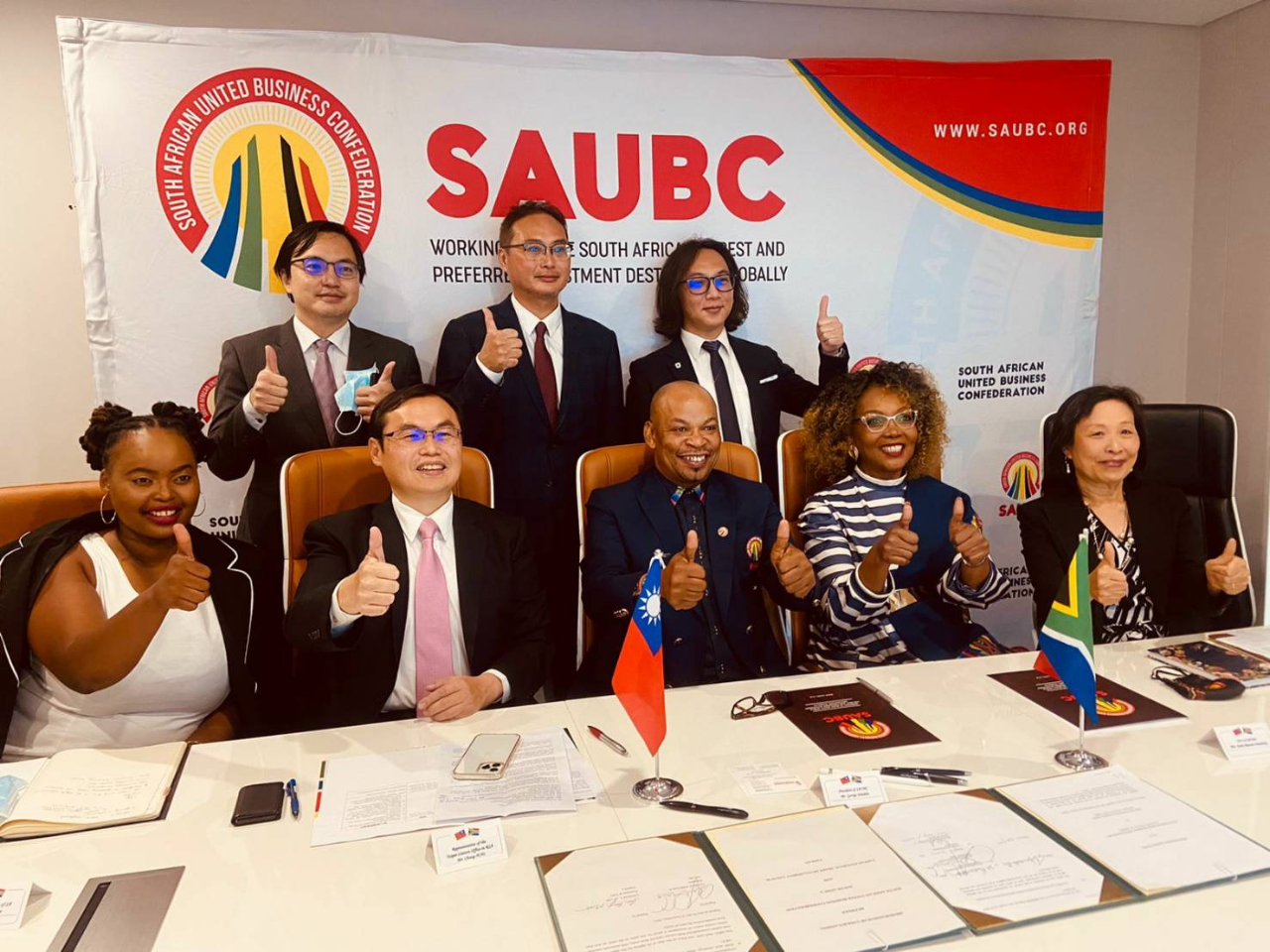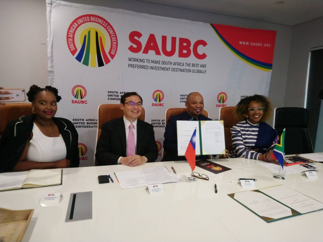 本處促成我外貿協會(TAITRA)及台灣非洲經貿協會(TABA)分別與「南非聯合企業總會」(SAUBC)簽署合作備忘錄拓展在非商機並深化台斐經貿交流