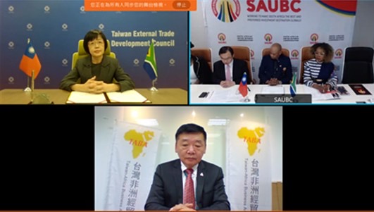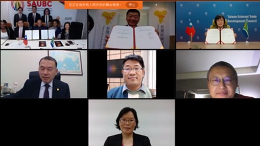 為拓展在非洲商機,深化台斐經貿交流,經駐南非代表處努力,促成外貿協會(TAITRA)及台灣非洲經貿協會(TABA)分別與「南非聯合企業總會」(South African United Business Confederation, SAUBC)簽署合作備忘錄,三方於本(110)年11月25日以視訊方式共同舉辦線上簽署兩份合作備忘錄儀式,由SAUBC理事長George Sebulela、貿協林秘書長芳苗及台灣非洲經貿協會孫理事長杰夫代表簽署。