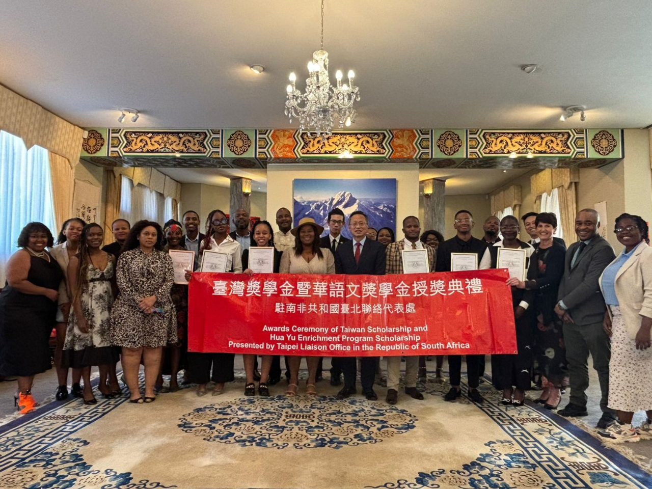 駐南非代表處於本(113)年9月6日舉辦臺灣獎學金暨華語文獎學金授獎典禮,邀請獎學金受獎生、家長及台灣之友會(Taiwan Alumni Association, TAA)代表參加,並安排相關同仁向受獎生説明簽證及在台居留相關規定,場面溫馨熱鬧。